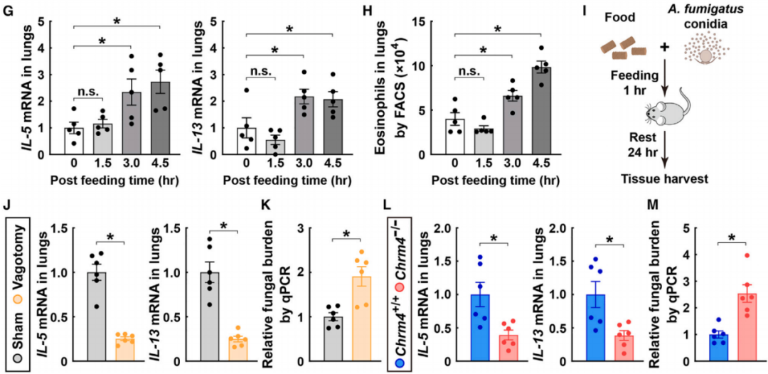 最后,作者探索了这种肠道-大脑-肺反射的神经免疫机制的生理意义。在没有IL-33或木瓜蛋白酶刺激的情况下,进食本身也足以诱导野生型小鼠肺组织中2型细胞因子的上调(图9G)和嗜酸性粒细胞的募集(图9H)。因此,作者推测进食诱导的肺部2型免疫增强可能作为一种保护机制,以抵御进食过程中潜在的病原体吸入。将这种掺杂了烟曲霉真菌孢子的饲料喂给小鼠,并通过qPCR分析检测特异性18S rRNA,以分析它们肺组织中的真菌负荷(图9I)。结果发现,阻断节后副交感神经输入的手术减弱了进食后的2型免疫反应(图9J),导致进食后24小时肺部的真菌负荷显著增加(图9K)。此外,Chrm4基因的缺失也导致了2型免疫反应的类似降低(图9L),并且无法有效清除肺组织中的烟曲霉(图9M)。这些结果表明,副交感神经信号(由肠道-大脑-肺反射引发)的进化,可能是为了应对进食过程中暴露于食物相关病原体的风险。