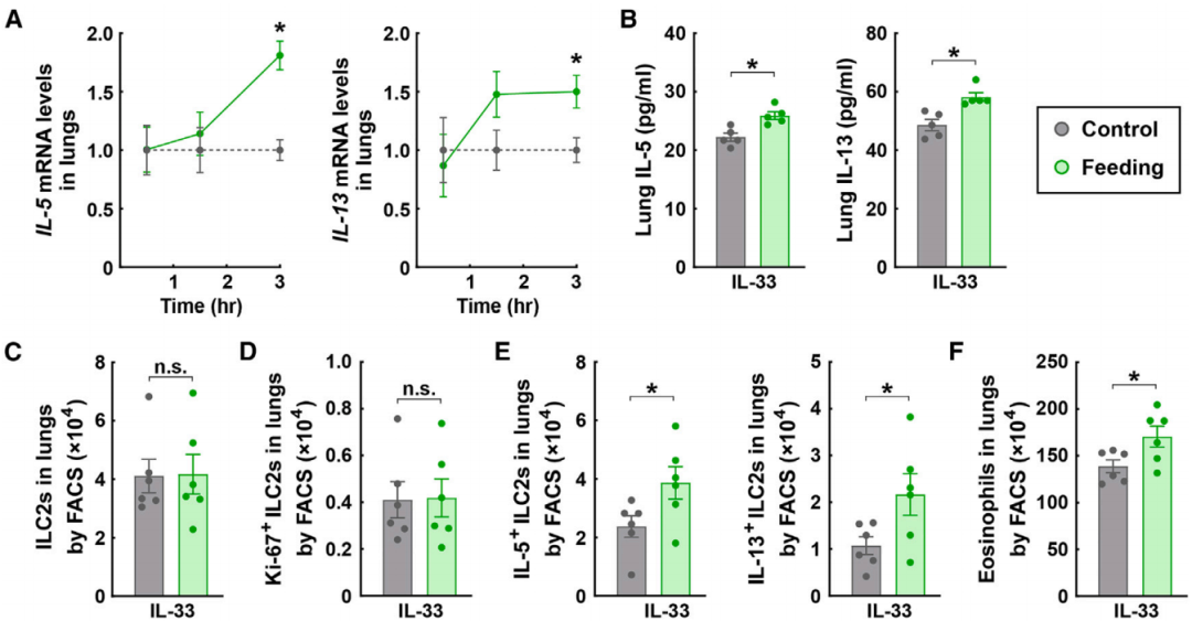 首先,研究利用小鼠2型免疫相关哮喘模型——通过鼻内给予重组小鼠IL-33来诱导肺部2型免疫反应。IL-33处理的小鼠随后被喂食正常饲料,以测试是否会影响2型免疫反应。在进食后3小时内,2型细胞因子IL-5和IL-13的mRNA水平显著增强(图1A),而在6小时左右恢复到基线水平。相应地,ELISA分析证实,进食条件下肺组织中IL-5和IL-13蛋白的含量增加(图1B)。尽管进食没有改变ILC2s的细胞数量(图1C)或它们的增殖(图1D),但通过荧光激活细胞分选(FACS)评估,发现它显著促进了ILC2s中2型细胞因子的蛋白表达(图1E)。此外,嗜酸性粒细胞的招募,作为2型免疫的一个关键特征,在进食小鼠的肺组织中也有所增加(图1F)。与此同时,作者发现进食能诱导由木瓜蛋白酶鼻内处理触发的2型免疫反应增强。值得注意的是,IL-33在这个由木瓜蛋白酶诱导的哮喘小鼠模型中发挥着关键作用。这些结果表明,进食后肺部2型免疫反应的加剧可以在小鼠模型中重现。