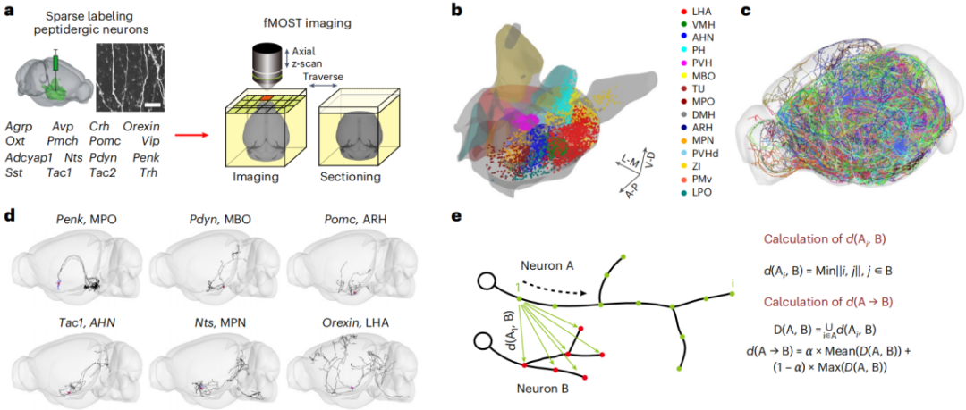 1、单神经元投射组映射:成功重建了166只成年雄性小鼠中16个肽能神经元群体的7180个个体神经元的全脑投射组。这些神经元的胞体分布与已知神经肽表达模式相符,轴突广泛投射到大脑两侧,占据约 21.8%(同侧)和 10.2%(对侧)的体素。
