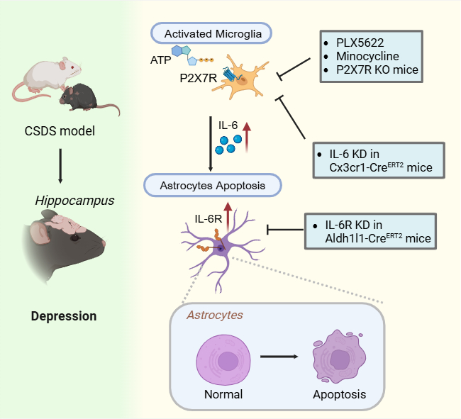 示意图:海马脑区小胶质细胞释放的IL-6诱导星形胶质细胞凋亡并介导焦虑抑郁样行为的示意图。