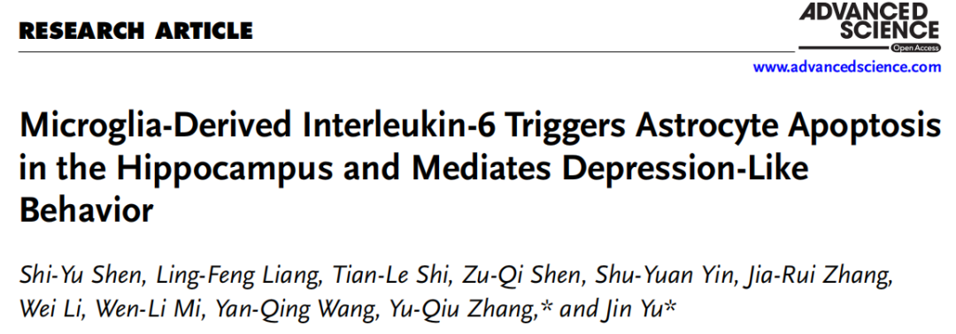 复旦大学基础医学院俞瑾教授和脑科学研究院张玉秋教授的合作研究发现,慢性应激会诱导海马脑区小胶质细胞激活并释放出白细胞介素6(Interleukin-6,IL-6),从而导致星形胶质细胞的萎缩丢失,这些机制与应激诱导的抑郁症样行为有关。2025年3月20日,该研究以Research Article的形式,以《小胶质细胞来源的白介素-6诱导海马星形胶质细胞凋亡并介导抑郁样行为》(“Microglia-Derived Interleukin-6 Triggers Astrocyte Apoptosis in the Hippocampus and Mediates Depression-Like Behavior”)为题在《Advanced Science》杂志在线发表。