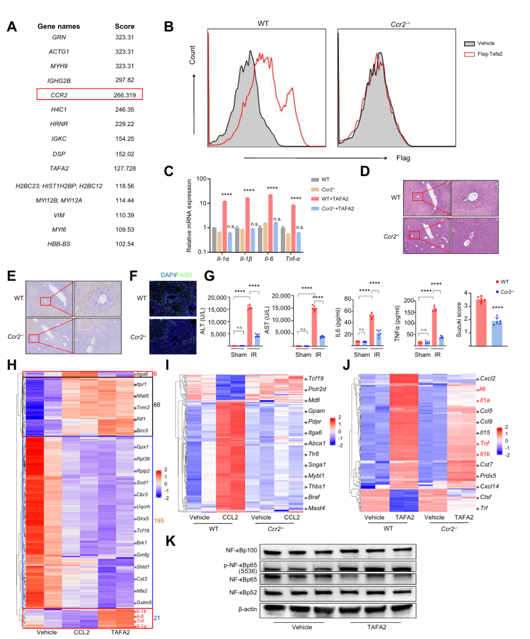 为了探究TAFA2与巨噬细胞的相互作用机制及CCR2的功能,研究首先通过免疫沉淀、质谱分析、流式细胞术等实验证实 CCR2 是巨噬细胞TAFA2的特异性受体。RNA-seq分析确认TAFA2或CCL2刺激的骨髓来源巨噬细胞(BMDM)转录谱几乎一致,66个与粘附、代谢、Ras信号通路相关差异基因表达上调,195个代谢和核糖体通路相关基因表达下调,TAFA2诱导的 Il1α、Il1β、Il6、Tnfα 等炎症基因及干扰素刺激基因表达水平更高,促进巨噬细胞介导的炎症响应。进一步活体实验表明CCL2对巨噬细胞的作用依赖于CCR2,TAFA2主要通过CCR2促进巨噬细胞介导的炎症反应,同时巨噬细胞上可能存在其他TAFA2受体。