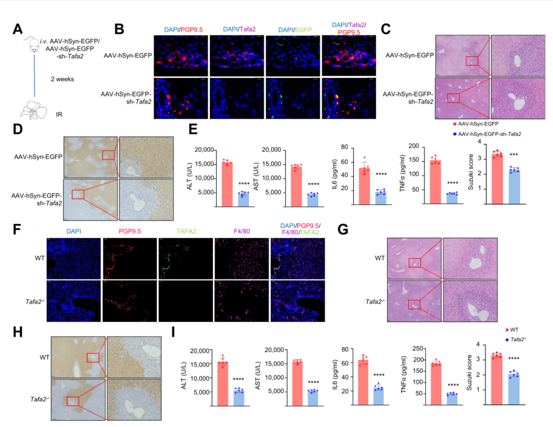 为探究神经元TAFA2在肝缺血再灌注损伤(IRI)中的作用,研究选用Tafa2敲除(KO)小鼠和AAV病毒(AAV-hSyn-EGFP-sh-Tafa2)实现的TAFA2敲低小鼠,发现TAFA2敲低或敲除可改善IRI引起的巨噬细胞浸润,肝组织损伤、细胞死亡及血清标志物升高。这进一步表明TAFA2在肝IRI中起关键促进作用,抑制其表达可减轻肝损伤。