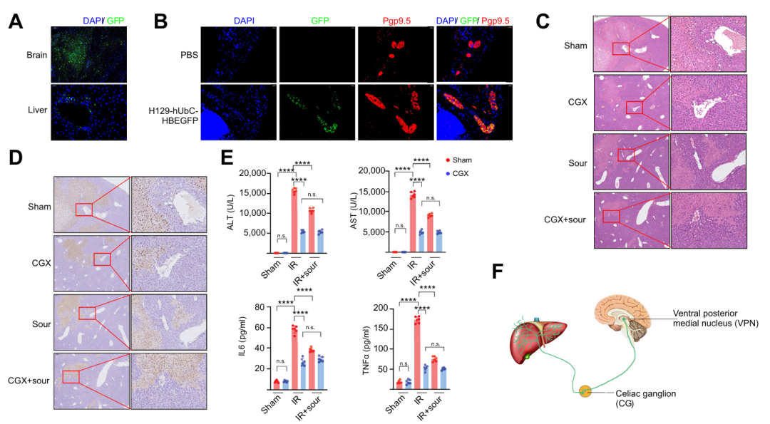 为绘制大脑和肝脏的联系,研究在小鼠VPM区注射单纯疱疹病毒 H129-hUbC- HBEGFP,发现脑、肝脏及腹腔神经节(CG)中均有荧光蛋白的表达。腹腔神经节切除后(CGX),酸刺激并没有降低IRI小鼠模型肝的组织损伤和血清标志物。这些结果进一步表明酸性刺激通过神经通路包括舌头、大脑和 CG介导肝脏保护效应,即脑-CG-肝轴。