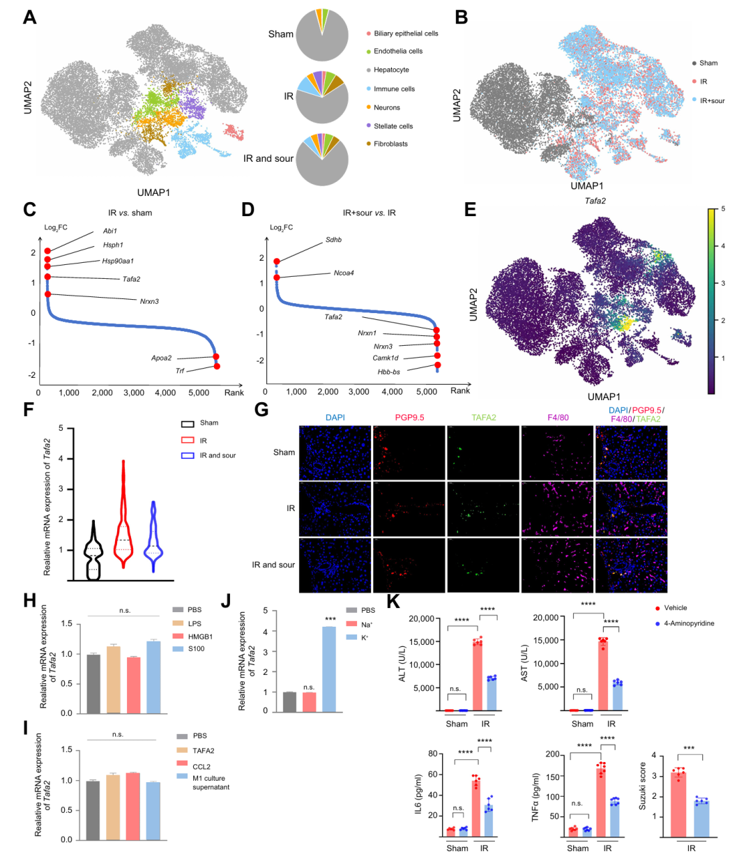 为探究酸味刺激肝和腹腔神经节(CG)的基因表达情况,研究对肝IRI、肝IRI + 酸味刺激及假手术的小鼠进行肝脏和CG单细胞核转录组测序,结果显示肝IRI 时,免疫细胞簇扩大,酸味刺激可减少该现象。TAFA2在神经元中特异性表达, IRI 时被诱导表达上调,酸味刺激后抑制其表达。海马神经元细胞系 HT22 中,钾离子可诱导TAFA2表达,而其他炎症因子不能;电压门控钾通道抑制剂可减少 TAFA2产生和肝损伤。这些结果表明酸刺激通过抑制肝内神经元中钾离子诱导的 TAFA2表达,实现神经系统减轻肝IRI。