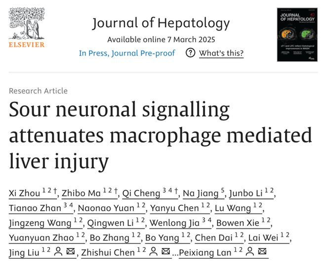 2025年3月7日,华中科技大学同济医学院同济医院器官移植研究所兰培祥、陈知水及刘静团队在 Journal of Hepatology上在线发表题为“Sour neuronal signalling attenuates macrophage mediated liver injury”的文章,研究表明酸刺激可减轻人类和小鼠的肝缺血再灌注损伤(IRI),并明确了脑-肝轴在肝 IRI中的关键作用,通过神经元分泌的TAFA2(TAFA 趋化因子样家族成员2) 招募 CCR2(C-C趋化因子受体2受体)激活巨噬细胞来介导肝 IRI,这一发现为肝病治疗提供了新见解和潜在的治疗策略。