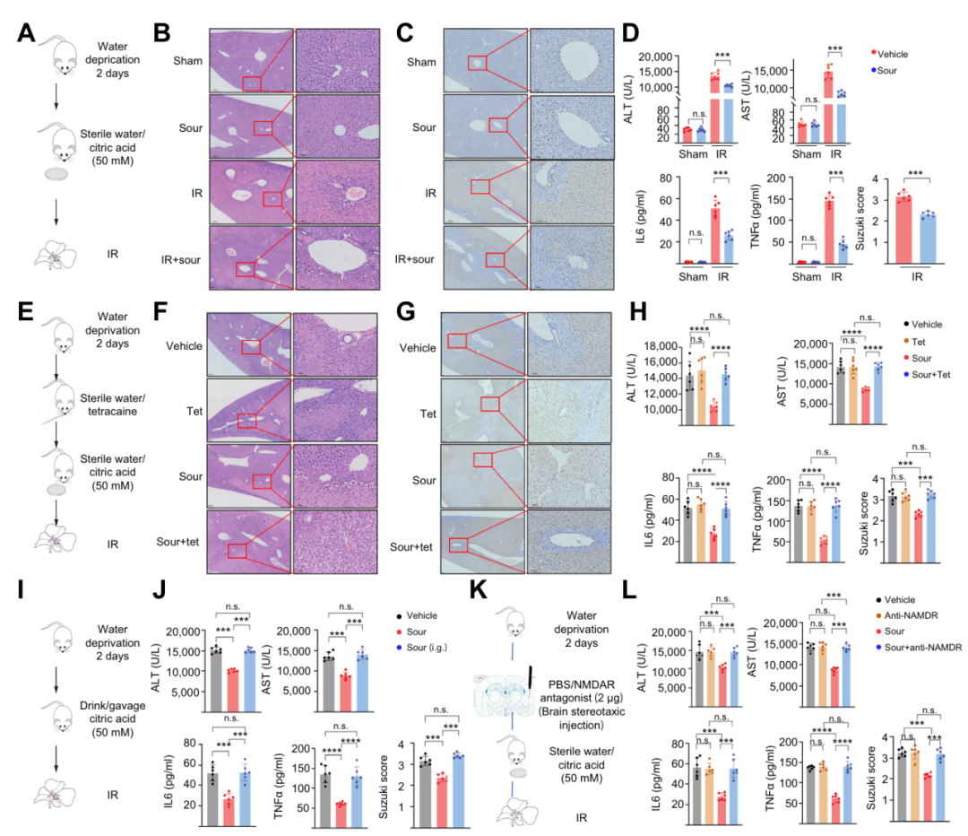 为探讨酸味对肝损伤的影响,研究构建肝缺血再灌注损伤(IRI)小鼠模型并进行酸刺激(柠檬酸),发现酸刺激可减少肝组织损伤以及血清标志物水平,而使用丁卡因阻断神经冲动局麻小鼠舌头或者灌胃柠檬酸时,酸刺激的保护作用被消除。NMDAR阻断剂立体定向注射到小鼠VPM脑区后,酸刺激后IRI肝的血清标志物水平和肝损伤程度无明显变化。这些结果表明神经系统在酸刺激减轻肝IRI过程中起重要作用。