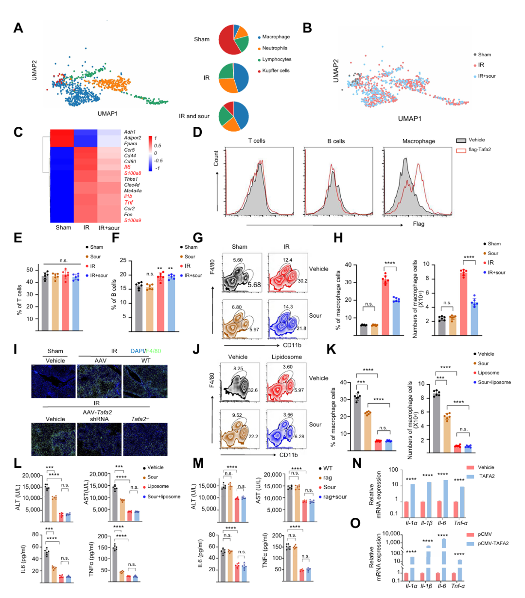 为阐明肝IRI中免疫细胞特征,研究通过单细胞测序发现肝IRI 时巨噬细胞簇比例增加且其炎症相关基因(如 Il1β、Il6、Tnf、S100)表达上调,而酸性刺激可减少这些基因表达。通过 FLAG 标记 TAFA2 结合实验及流式细胞术证实 TAFA2 特异性结合巨噬细胞,且 TAFA2 敲除或敲低会抑制 IRI 时巨噬细胞向肝脏浸润。体外实验也表明 TAFA2 可激活骨髓来源巨噬细胞并诱导炎症因子表达,证实巨噬细胞被 TAFA2 激活并介导肝脏IRI。