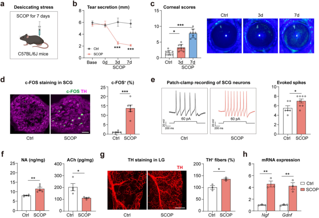 交感神经系统在 “战斗或逃跑” 反应中至关重要。为探究干眼应激下SNS 活动变化,采用东莨菪碱(SCOP)联合慢性干燥应激的干眼小鼠模型(图2a)。结果显示,SCOP处理3天后泪液减少(图2b),7天后角膜损伤(图2c)。同时,干眼小鼠交感神经颈上神经节(SCG,交感神经链中最大的神经节)中c-FOS⁺ TH⁺神经元数量较对照增加12倍(图2d),膜片钳记录显示SCG神经元动作电位频率升高(图2e)。此外,SCOP处理7天后,干眼小鼠泪腺中去甲肾上腺素(NA)浓度和交感神经密度升高(图2f-g),乙酰胆碱(ACh)浓度和ChAT表达降低(图2f),神经营养因子Ngf和Gdnf表达上调(图2h)。综上,SCOP和干燥应激可诱导泪腺交感神经激活,提示其参与调控泪液减少和干眼发生。