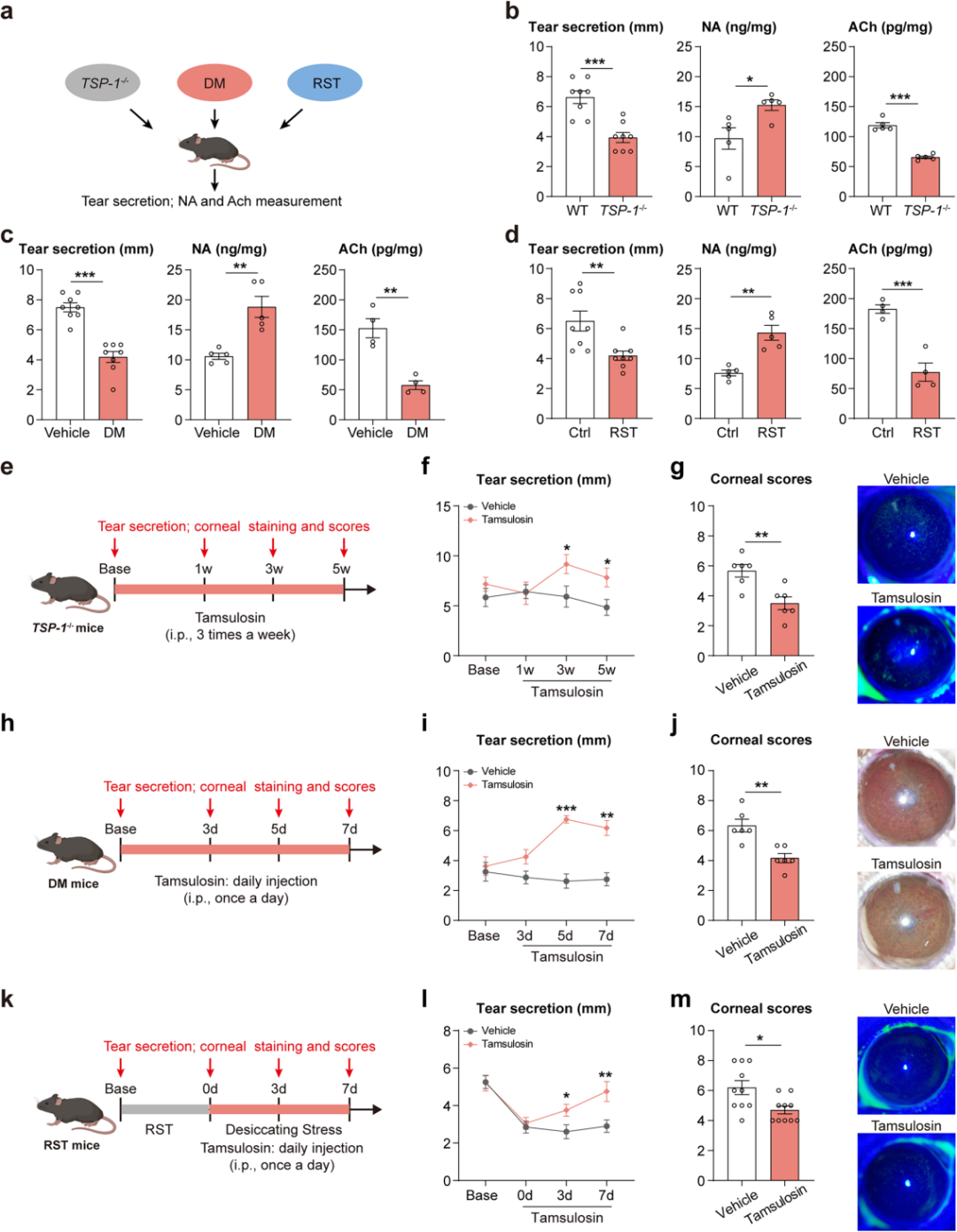 干眼是一种多因素病因的疾病,其中泪腺功能障碍可导致水液缺乏型干眼疾病。为验证SNS激活在不同水液缺乏型干眼疾病中的作用,研究人员进一步研究了三种不同的干眼小鼠模型:干燥综合征(TSP-1⁻/⁻)、糖尿病和束缚应激模型,这些模型均表现出明显的泪液减少和角膜损伤(图5a-d)。与对照组和野生型小鼠相比,这三种干眼小鼠的泪腺中均出现相似的NA升高和ACh降低的变化(图5a-d)。腹腔注射Adra1a拮抗剂坦索罗辛(图5e, h, k),结果显示坦索罗辛治疗同样改善了这三种不同水液缺乏型干眼小鼠的泪液分泌(图5f, i, l)和角膜损伤(图5g, j, m)。相比之下,干燥综合征的TSP-1⁻/⁻小鼠的泪液分泌改善速度较糖尿病和束缚应激小鼠更慢。综上结果表明,泪腺的SNS激活可能是多种水液缺乏型干眼疾病的共同机制和治疗靶点。