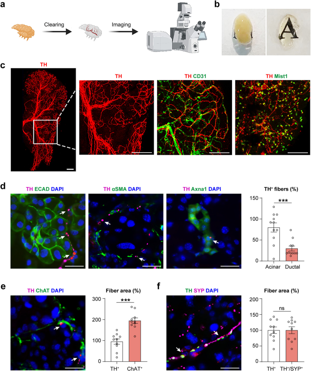 为了可视化完整神经纤维,采用透明化方法将小鼠眶外泪腺进行荧光成像(图1a)。通过酪氨酸羟化酶(TH)的免疫标记来检测交感神经支配。经过组织透明化处理后,泪腺实现了光学透明(图1b)。结果显示,交感神经的完整网络和分支模式在单纤维分辨率下得以可视化(图1c)。随后,进行TH与血管内皮标记物CD31、腺泡细胞标记物Mist1、上皮标记物E-钙粘蛋白(ECAD)、肌上皮细胞标记物αSMA、导管细胞标记物Axna1以及副交感神经标记物胆碱乙酰转移酶(ChAT)的共免疫标记。解剖学角度来看,泪腺交感神经分为沿血管的大神经束及延伸至腺泡和间质的小纤维,多数纤维围绕腺泡和肌上皮细胞,部分靠近导管细胞(图1c-d)。定量分析表明,TH⁺交感神经的密度是 ChAT⁺副交感神经的一半(图1e),这与之前关于泪腺中副交感神经支配占主导地位的描述一致。此外,交感神经表达突触小泡和突触前末端的标记物突触素(SYP)(图1f)。最终,明确小鼠泪腺中交感与副交感神经的不同分布模式。