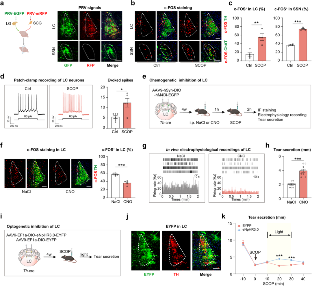 蓝斑核已被报道可调节全身交感神经输出。为探讨LC在交感神经调控泪液分泌中的潜在作用,东莨菪碱处理小鼠后LC和SSN中c-FOS⁺细胞增加(图7b-c),且LC神经元动作电位爆发频率更高(图7d),提示交感神经LC和副交感神经 SSN神经元被激活。采用化学遗传学(向Th-cre小鼠LC注射编码hM4Di的AAV9)(图7e-g)和光遗传学(注射编码eNpHR3.0的AAV9)(图7i-j)抑制LC肾上腺素能神经元。结果显示,抑制LC后,Th-cre小鼠泪液分泌显著增加(图7h, k)。综上所述,LC是控制泪腺泪液分泌的关键交感神经脑核。