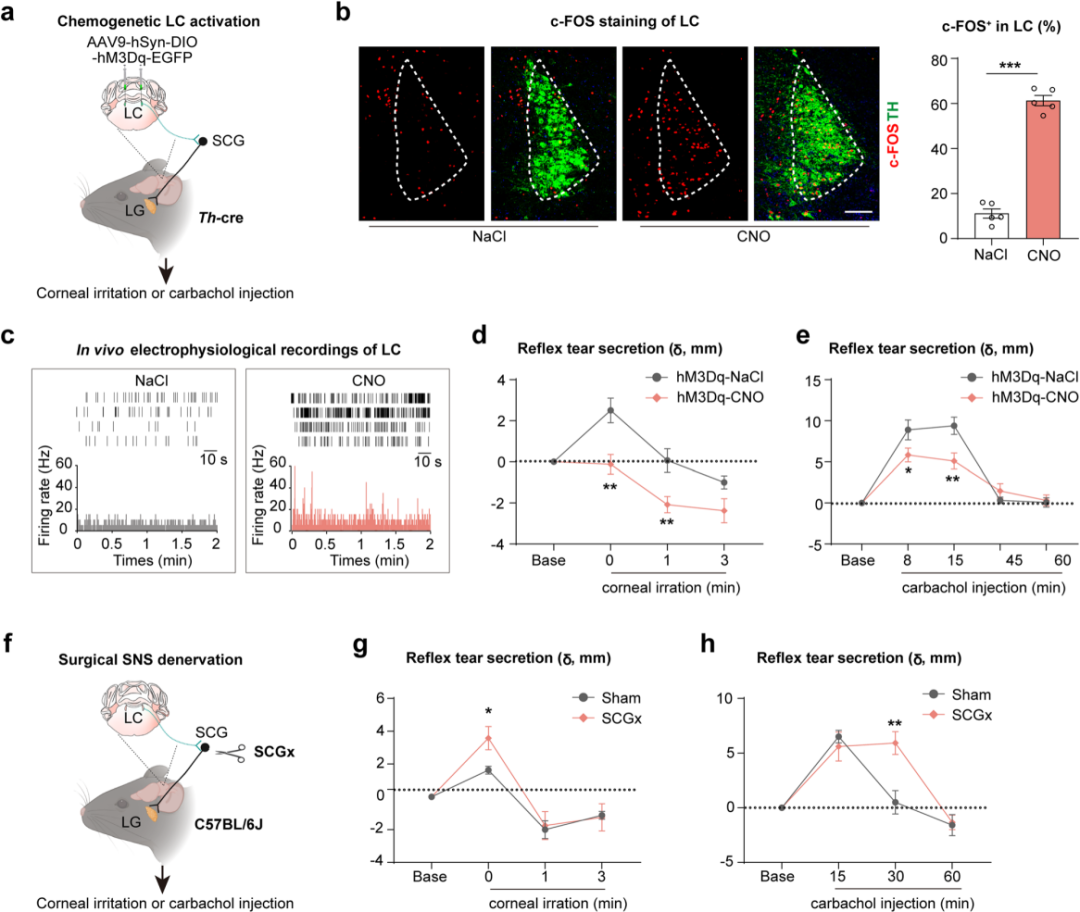 接下来进一步探究蓝斑核-颈上神经节-泪腺轴(LC-SCG-LG axis)在调控反射性泪液分泌中的作用,采用角膜尼龙线刺激和腹腔注射卡巴胆碱的小鼠模型,二者均可诱发快速反射性泪液分泌。向Th-cre小鼠双LC侧注射AAV9-DIO-hM3Dq(图8a)。免疫荧光染色和电生理检测证实,给CNO后LC神经元被激活(图8b-c)。结果显示,角膜刺激诱导的反射性泪液分泌升高在该模型中被完全抑制(图8d),而卡巴胆碱注射诱导的分泌升高则部分降低(图8e)。此外,通过SCGx进行外周交感神经消融后(图8f),角膜刺激小鼠的反射性泪液分泌升高进一步增强(图8g),卡巴胆碱注射小鼠的分泌升高持续时间延长(图8h)。综上所述,LC-SCG-LG轴可以精确控制反射性泪液分泌量和持续时间,以防止泪液过度分泌。