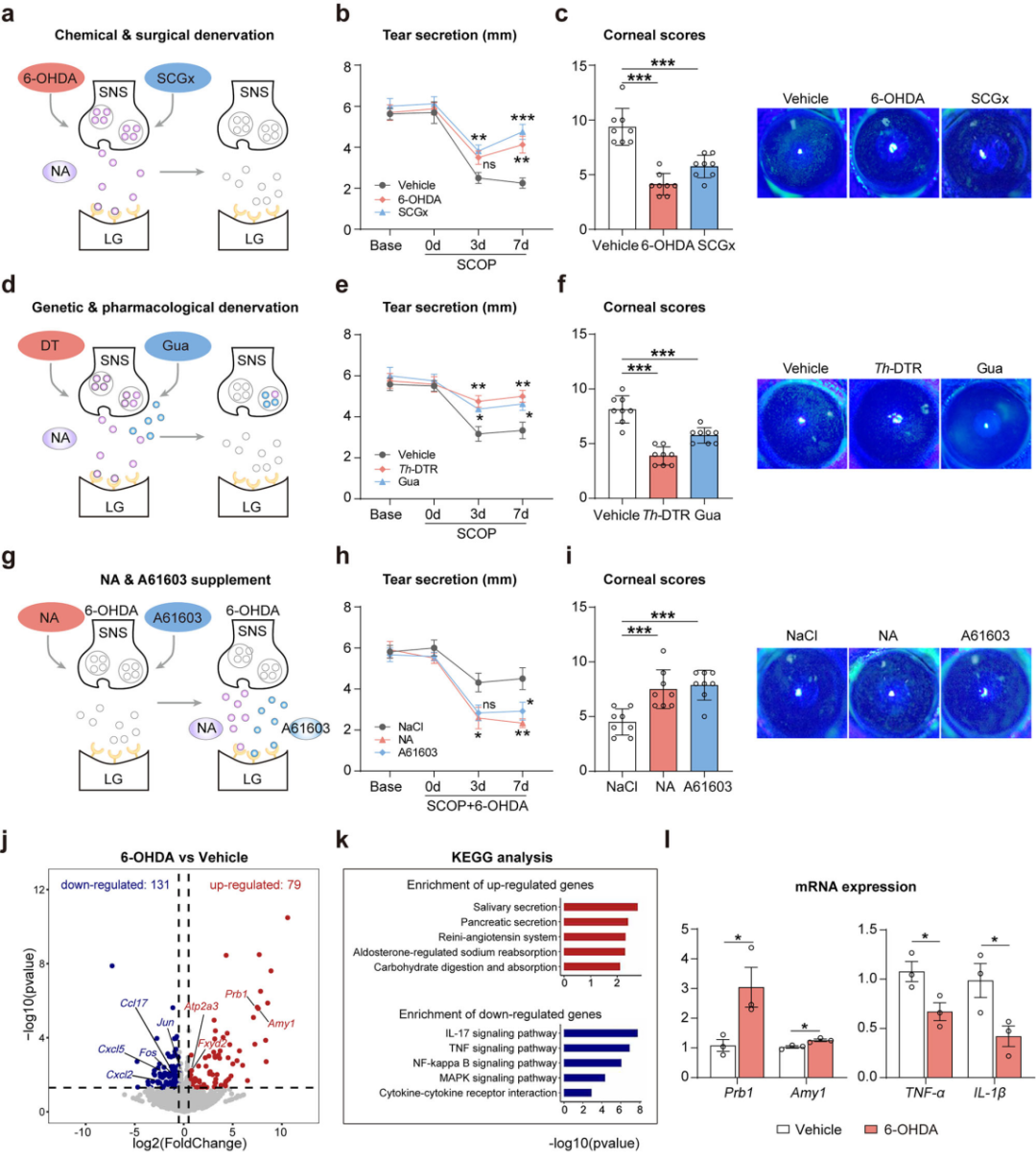 为将SNS去神经改善的泪液分泌与泪腺功能恢复直接关联,研究人员进一步对小鼠泪腺进行了转录组和组织学分析。结果显示6-OHDA处理使泪腺79个基因上调和131个基因下调(图3j),KEGG分析表明,上调基因富集于分泌信号通路,下调基因富集于炎症通路(图3k)。定量PCR证实,6-OHDA处理的泪腺中Prb1(编码碱性唾液脯氨酸丰富蛋白1)和Amy1(编码淀粉酶)转录本上调,TNF-α和 IL-1β转录本下调(图3l)。综上,SNS失活通过改善干眼小鼠的泪腺功能增加泪液分泌。