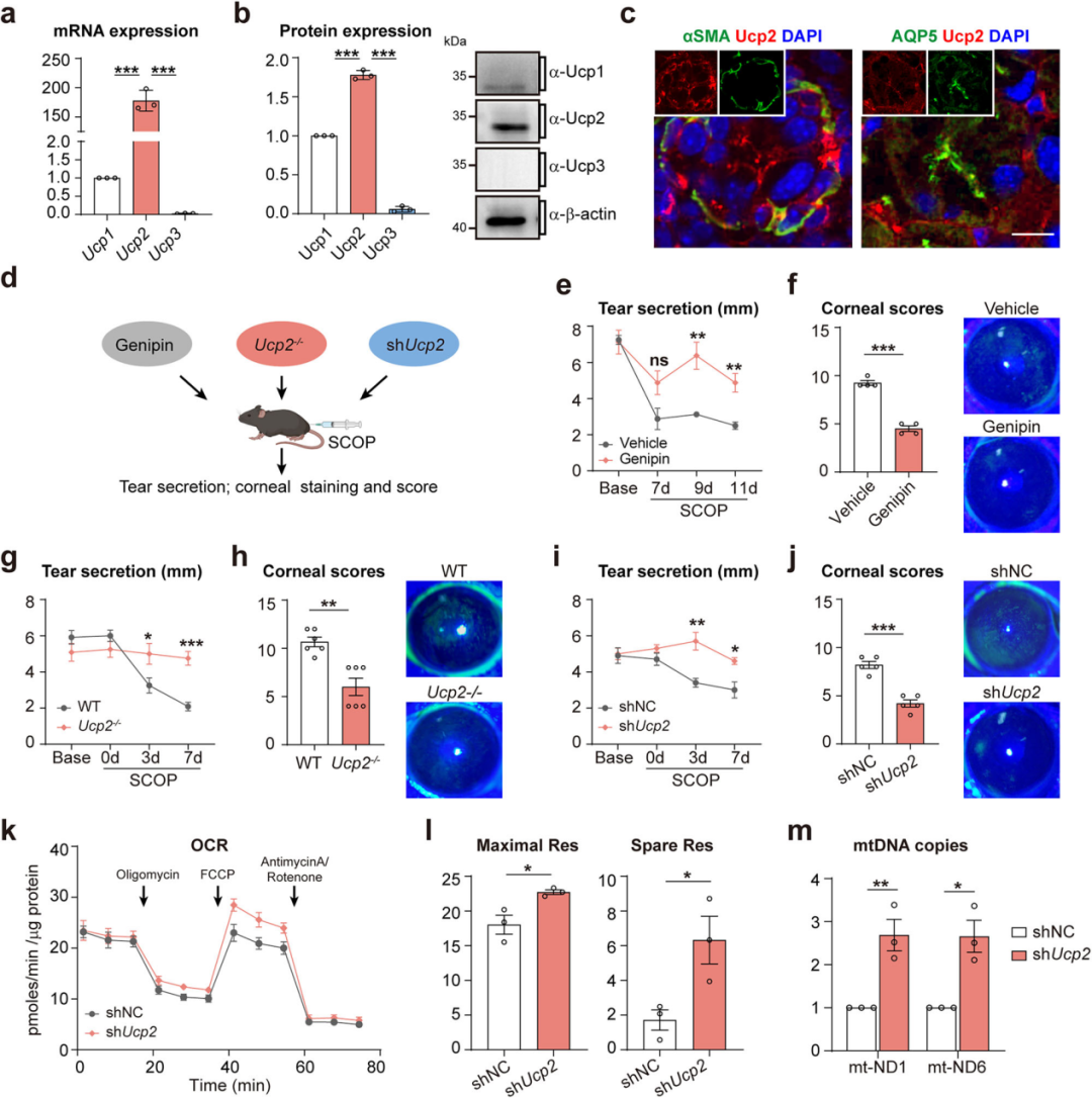 确定Adra1a主导作用后,探索SNS激活调控泪液分泌的下游通路。因解偶联蛋白 2(Ucp2)可被SNS激活并参与多种生理调控,检测发现Ucp2在小鼠泪腺中表达丰富(图6a-b),且东莨菪碱和慢性干燥应激显著上调Ucp2,免疫标记显示Ucp2与肌上皮和腺泡细胞共定位(图6c)。为明确Ucp2在SNS调控泪液分泌中的作用,在C57BL/6 J小鼠中进行干眼诱导实验,分别采用Ucp2抑制剂京尼平预处理或使用Ucp2⁻/⁻小鼠(图6d),结果显示京尼平预处理小鼠和 Ucp2⁻/⁻小鼠的泪液分泌(图6e-g)和角膜损伤(图6f-h)显著改善。向泪腺注射Ucp2干扰AAV(shUcp2)并诱导干眼,结果显示Ucp2敲低同样改善了泪液分泌和角膜损伤(图6i-j),并提升线粒体呼吸能力与DNA拷贝数(图6k-m)。综上,泪腺Ucp2主导慢性干眼应激下SNS调控的泪液分泌过程。