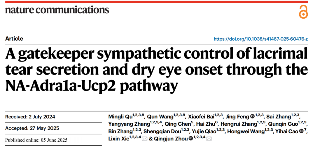 2025年6月5日,山东第一医科大学附属眼科研究所谢立信院士、周庆军研究员团队在Nature Communications上发表题为“A gatekeeper sympathetic control of lacrimal tear secretion and dry eye onset through the NA-Adra1a-Ucp2 pathway”相关文章,研究发现交感神经系统(SNS)在泪腺中存在完整神经支配,在多种干眼应激下会被激活,通过去甲肾上腺素(NA)激活α1a肾上腺素能受体(Adra1a),调控线粒体解偶联蛋白2(Ucp2),从而减少泪液分泌并促使干眼发生。