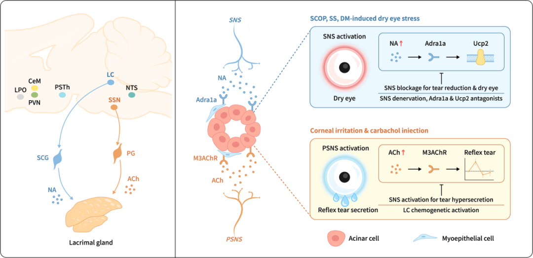 泪液由泪腺等分泌,对眼表保湿和保护至关重要,其分泌不足会导致水液缺乏型干眼,全球成人患病率为5%-50%。传统认为副交感神经(PSNS)主导泪液分泌,而交感神经(SNS)的作用存在争议,其在干眼应激下的体内病理作用及下游通路尚不明确,限制了干眼治疗策略的发展。