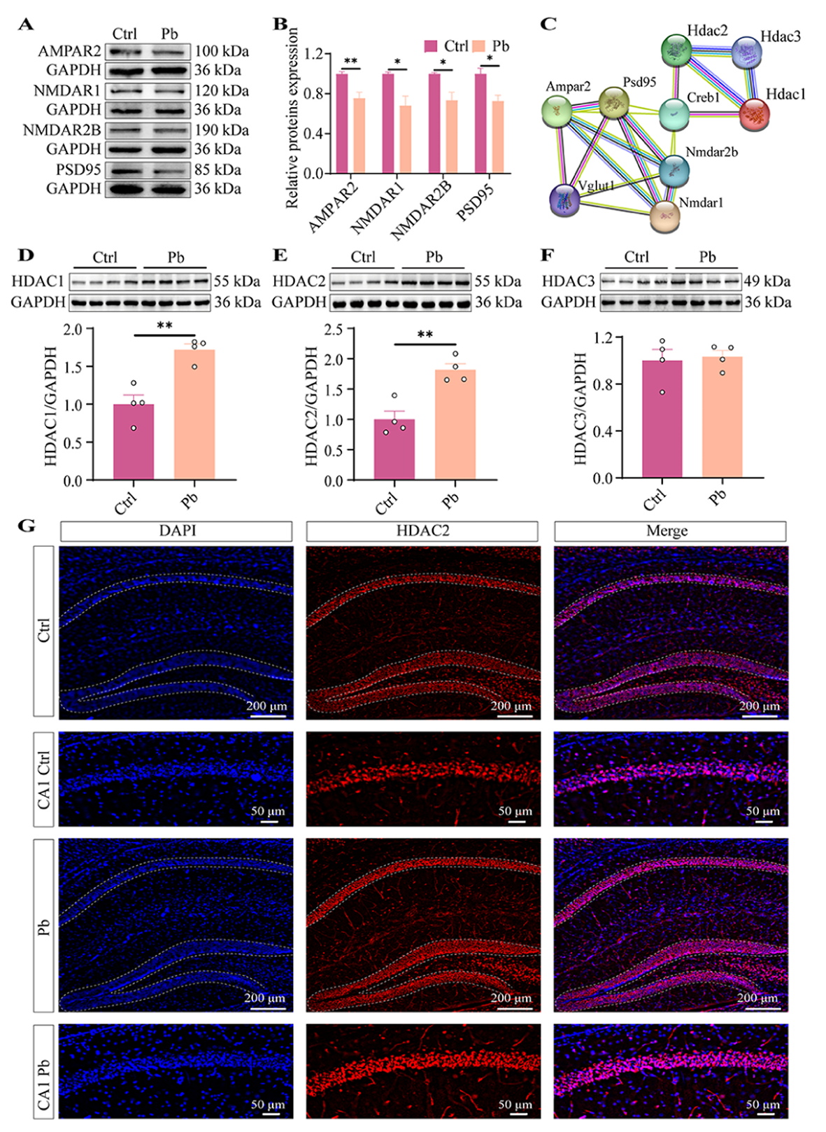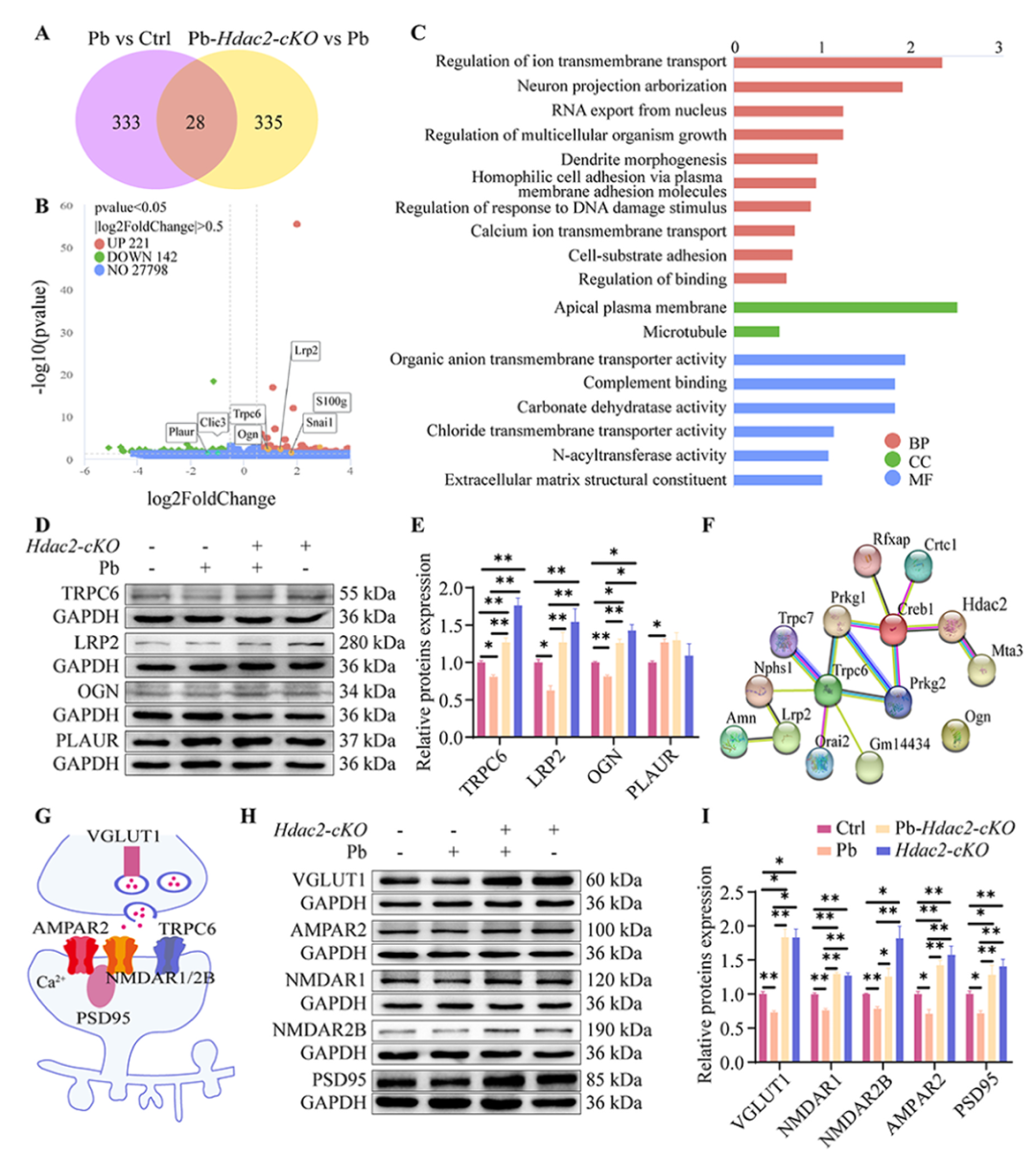 为探究HDAC2重编程调控铅诱导的CA1区兴奋性神经元损伤的分子机制。将Pb组与Ctrl组,Pb-Hdac2-cKO 组与Pb组小鼠的 CA1 区组织进行mRNA测序获得28个差异基因,基因本体(GO)富集分析显示这些基因参与钙离子跨膜运输、树突形态发生等与神经元结构和功能相关的通路,可能介导铅的损伤及 HDAC2敲除的修复作用。蛋白水平检测发现铅暴露使TRPC6、LRP2 等蛋白表达降低,而HDAC2敲除可逆转这一趋势,这验证了RNA测序结果的可靠性。STRING预测显示HDAC2与TRPC6、LRP2等靶基因存在相互作用。Hdac2条件性敲除能够逆转铅暴露引起的海马CA1区兴奋性神经元中VGLUT1、NMDAR1、NMDAR2B、AMPAR2和PSD95蛋白的减少。综上,这些结果表明铅通过升高HDAC2的表观遗传重编程,抑制与突触可塑性相关的靶基因的蛋白表达,进而损害神经元的结构和功能活性。