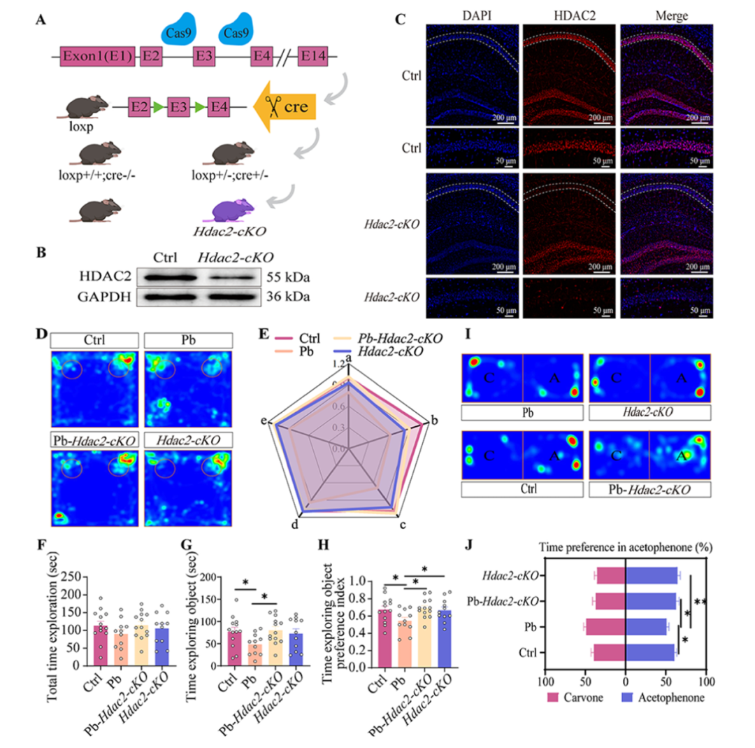 研究将培育的Hdac2flox/flox小鼠与CaMKIIa-Cre转基因小鼠杂交构建Hdac2条件性敲除(Hdac2-cKO)小鼠,进一步通过qRT-PCR、Western Blot和免疫组织化学验证并确认小鼠海马CA1区神经元中HDAC2的成功敲除,同时发现Hdac2-cKO可提高Pb-Hdac2-cKO小鼠和Hdac2-cKO小鼠的H3K9ac蛋白水平。采用NOR和ORM检测非空间记忆,结果显示,两组物体总探索时间无变化,与Pb组小鼠相比,Pb-Hdac2-cKO和Hdac2-cKO小鼠对新物体及苯乙酮的时间偏好指数均显著升高;Pb-Hdac2-cKO小鼠对新物体的探索时间较Pb组小鼠显著增加,而Hdac2-cKO小鼠无此变化。这表明Hdac2条件性敲除决定了铅暴露诱导的非空间记忆缺陷易感性的反应。