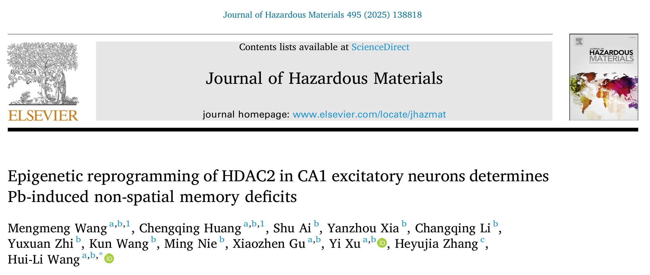 2025年6月2日,合肥工业大学汪惠丽教授研究团队在Journal of Hazardous Materials期刊发表了题为Epigenetic reprogramming of HDAC2 in CA1 excitatory neurons determines Pb-induced non-spatial memory deficits的研究论文。该研究首次揭示铅暴露通过损伤CA1兴奋性神经元增加非空间记忆缺陷易感性,而HDAC2表观遗传重编程是这一易感性的重要触发因素。
