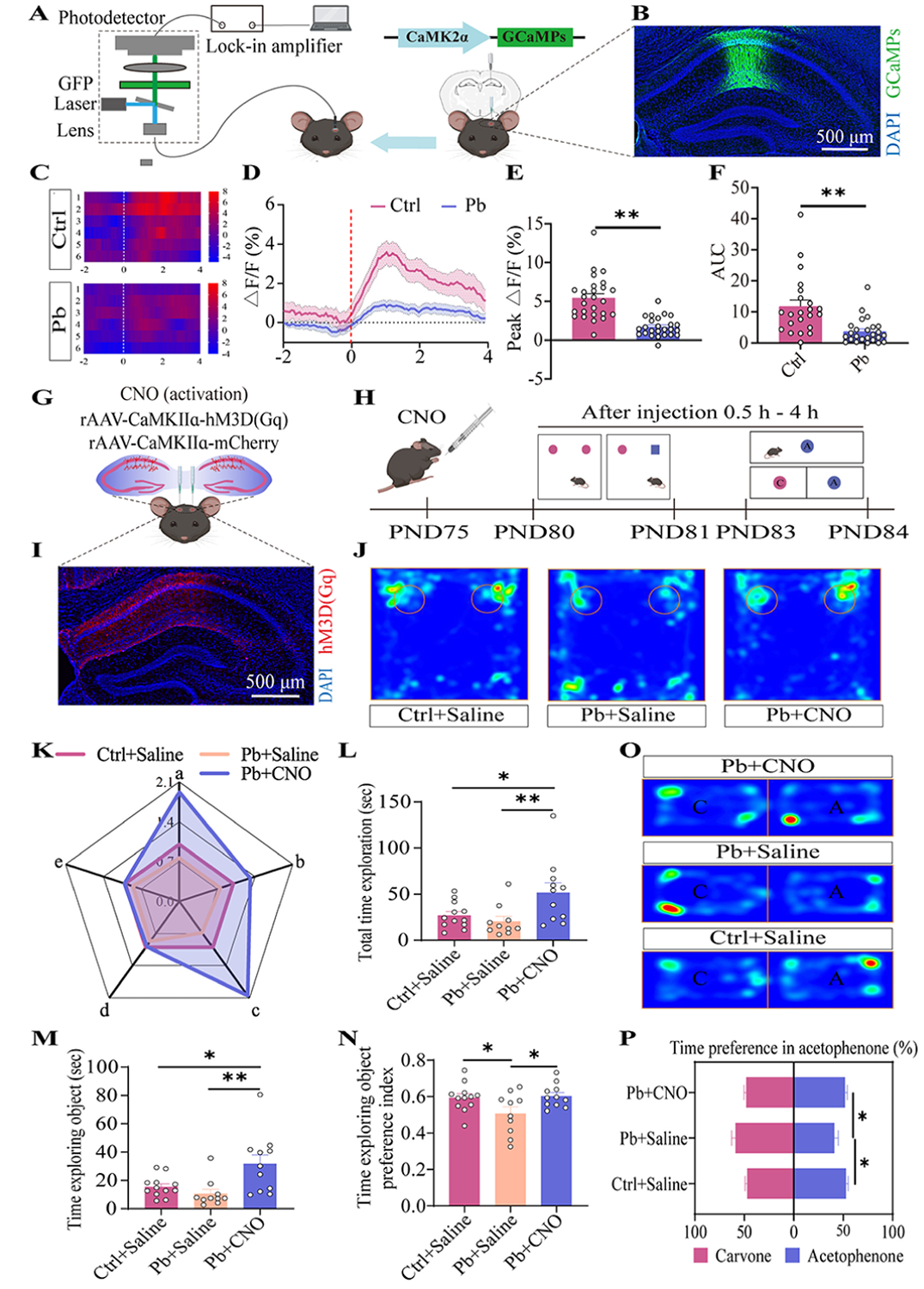 海马CA1区锥体细胞参与联想记忆的信息处理和编码。研究通过向该区域注射 rAAV-CaMKIIɑ-GCaMP6s病毒并结合光纤光度计记录,发现与Ctrl组相比,Pb组小鼠CA1区兴奋性神经元的钙离子信号、峰值振幅及曲线下面积(AUC)均显著降低。通过化学遗传学方法激活Pb组小鼠海马CA1区兴奋性神经元(注射 rAAV-CaMKIIɑ-hM3D(Gq)-mCherry病毒),结合NOR和ORM实验结果发现,与Pb+Saline组相比,Pb+ CNO组小鼠在对两个物体的总探索时间、对新物体的探索时间和时间偏好指数以及对苯乙酮的时间偏好指数上均显著增加。这表明激活CA1区兴奋性神经元后,铅暴露小鼠的非空间记忆水平有所提升。与Ctrl+Saline组相比,Pb+ CNO组小鼠对两个物体的总探索时间和对新物体的探索时间显著增加,表明CA1区兴奋性神经元在环境风险因素(如铅暴露)诱导的非空间记忆缺陷易感性中起到决定性作用。