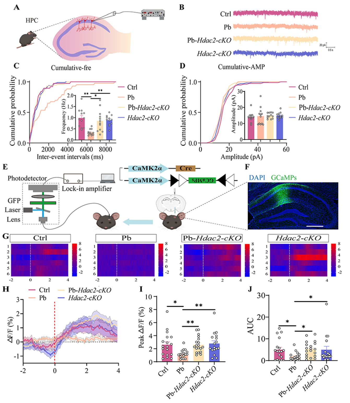 进一步通过小鼠海马 CA1区注射Cre依赖的GCaMP6s病毒记录钙信号,发现,与Ctrl组相比,Pb组小鼠海马CA1区兴奋性神经元的钙信号、峰值振幅及曲线下面积显著降低;而与Pb组小鼠相比,Pb-Hdac2-cKO小鼠和Hdac2-cKO小鼠的上述指标均显著增加。这表明铅通过升高HDAC2的表观遗传重编程导致CA1 区兴奋性神经元活动降低,而敲除HDAC2可恢复这种降低的活动。