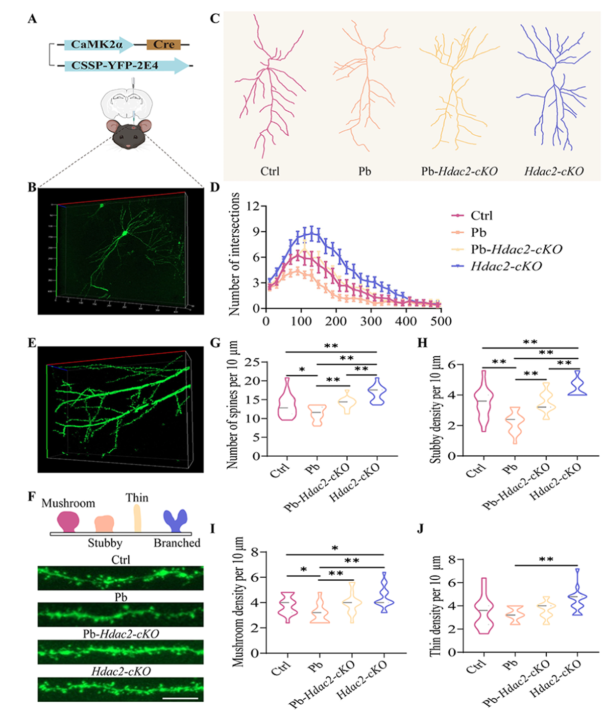 图6 Hdac2-cKO可恢复铅诱导的海马兴奋性神经元结构缺陷。