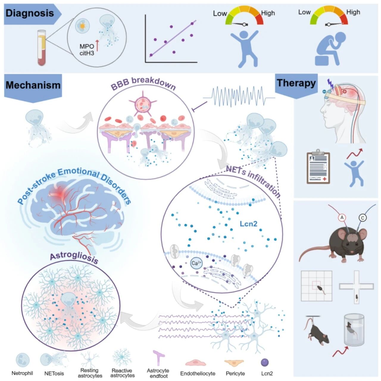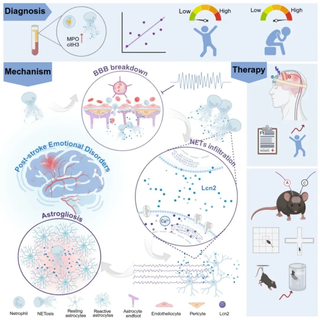 NETs是由活化的中性粒细胞释放的、由DNA和抗菌蛋白构成的网状结构,它们是机体抵抗感染的防线,但其过度生成也是多种炎症性疾病的关键病理环节。这一发现提示了一个全新的病理机制假说:卒中破坏了血脑屏障的完整性,允许外周循环中过量生成的NETs侵入中枢神经系统,进而诱发情绪障碍。