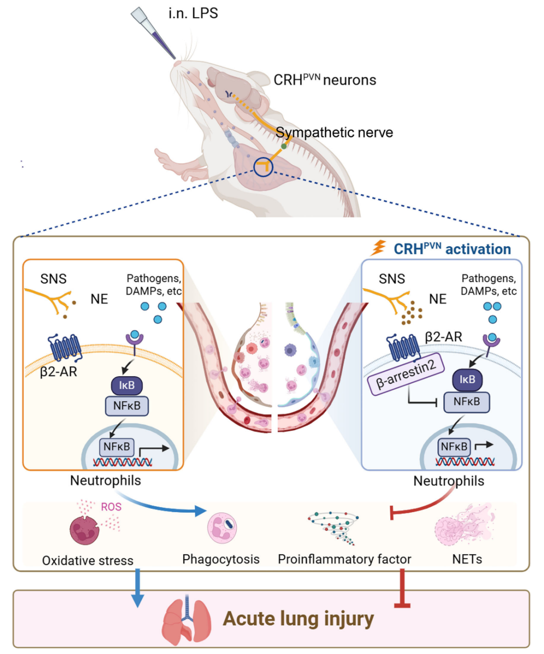 本文首次揭示“CRHᴾⱽᴺ神经元-肺交感神经-中性粒细胞”轴。CRHᴾⱽᴺ神经元激活后通过增强肺交感神经活性释放NE,NE结合中性粒细胞β₂-AR并激活β-arrestin2,进而抑制NF-κB通路,最终减少中性粒细胞浸润与致病功能,减轻ALI损伤。未来其他脑区及PVN内其他神经元群体在肺部炎症调控中的作用需进一步研究以完善脑-肺调控网络,并动态监测CRHᴾⱽᴺ神经元在ALI不同阶段的活性变化,结合非侵入性神经调控技术等开展长期研究,验证基于CRH神经元的干预策略安全性与最佳疗效。