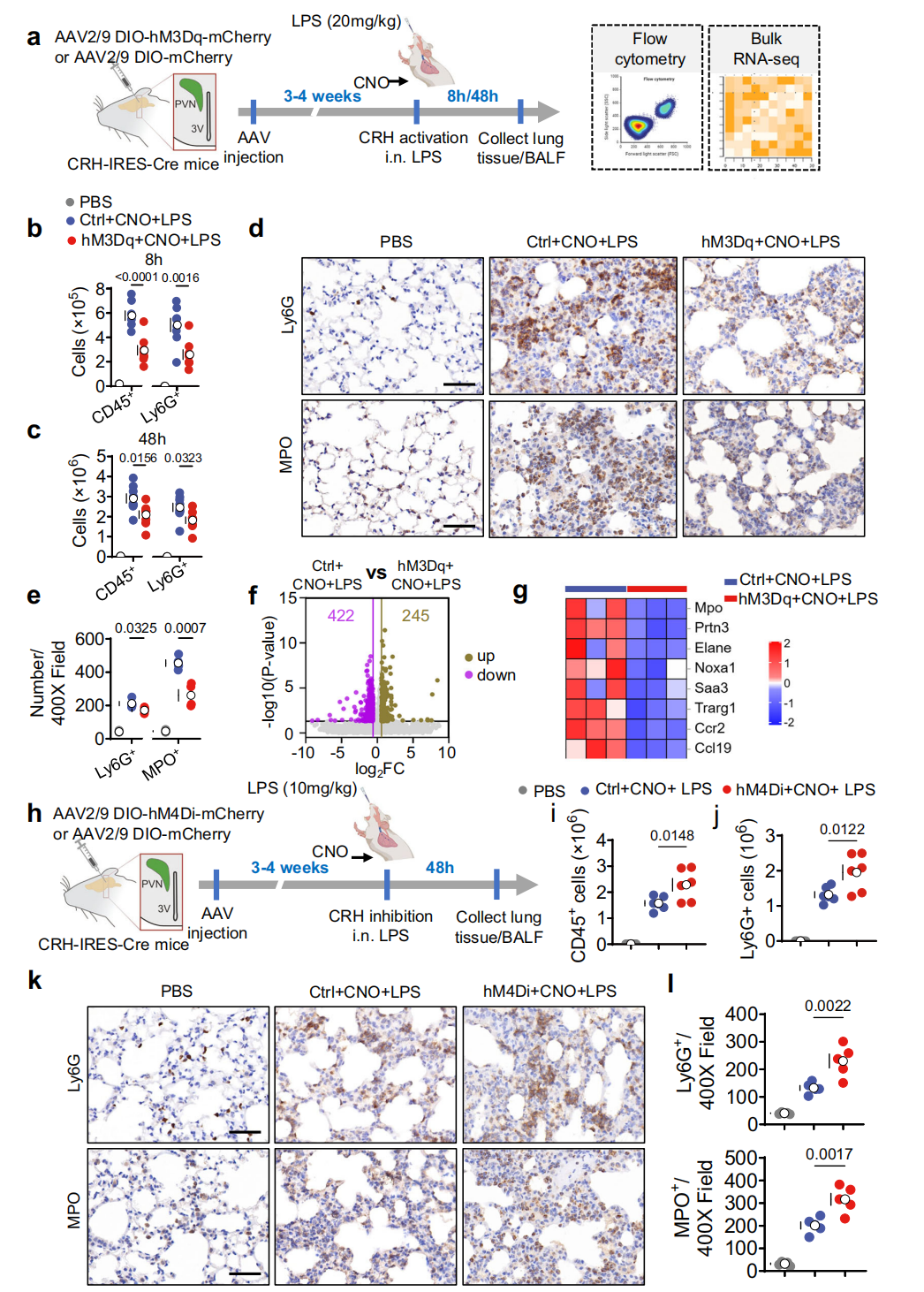鉴于中性粒细胞在炎症相关ALI中的关键作用,研究分析了CRHᴾⱽᴺ神经元激活或抑制后,LPS处理小鼠BALF及肺组织中白细胞(含中性粒细胞)的变化。激活该神经元时,流式细胞术显示LPS暴露8小时和48小时后,BALF与肺部的CD45⁺白细胞、Ly6G⁺中性粒细胞浸润显著减少(图3a-c),免疫组化显示肺内Ly6G⁺中性粒细胞及髓过氧化物酶(MPO,可致氧化性组织损伤)阳性细胞增多现象被抑制(图3d-e),肺组织RNA测序显示中性粒细胞相关基因及细胞因子通路表达降低(图3f-g)。抑制该神经元则会增加上述细胞数量(图3h-l)。综上表明CRHᴾⱽᴺ神经元在ALI期间可调控中性粒细胞向肺部的募集。