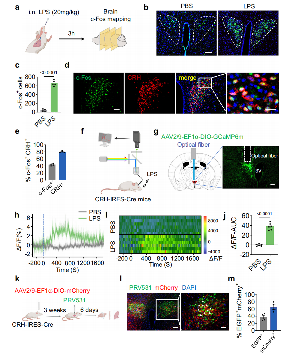 本研究通过鼻内滴注脂多糖(LPS)构建小鼠急性肺损伤(ALI)和急性呼吸窘迫综合征(ARDS)模型,探究大脑对肺损伤的调控作用(图1a)。LPS暴露3小时后,c-Fos检测发现包括下丘脑室旁核(PVN)在内的6个脑区神经元激活,且近80%的PVN内CRH⁺神经元与c-Fos⁺共定位(图1b-e)。进一步向CRH-IRES-Cre小鼠PVN注射AAV-EF1α-DIO-GCaMP6m并通过光纤监测,证实LPS可增强CRHᴾⱽᴺ神经元钙信号(图1f-j)。进一步探究PVN中的CRHᴾⱽᴺ神经元是否向肺部投射传出信号,向CRH-IRES-Cre小鼠PVN注射AAV2/9-Ef1α-DIO-mCherry实现CRHᴾⱽᴺ神经元的可视化,3周后向肺部注射表达绿色荧光蛋白的伪狂犬病病毒(PRV)逆行追踪,6天后在PVN的大量CRH神经元中观察到GFP信号,这证明CRHᴾⱽᴺ神经元与肺部存在神经解剖学连接(图1k-m)。