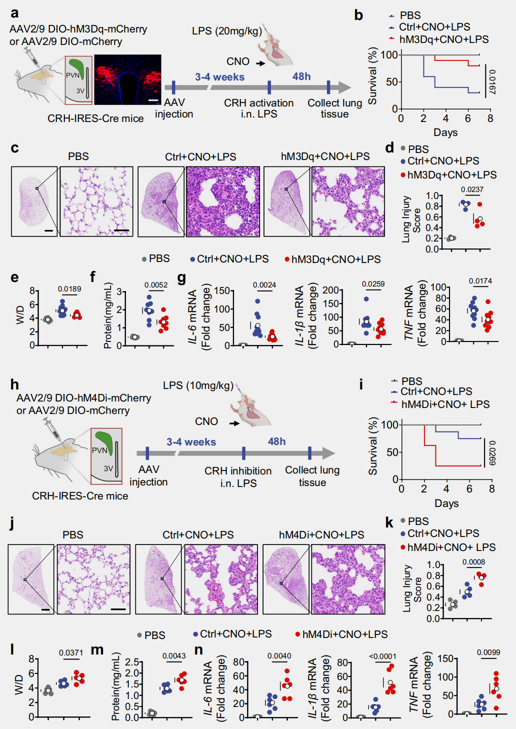 为探究CRHᴾⱽᴺ神经元对小鼠ALI的调控作用,研究采用化学遗传学方法,向CRH-IRES-Cre小鼠PVN注射兴奋性AAV病毒(hM3Dq)或对照病毒(Ctrl)(图2a),持续激活该神经元5天可显著提高小鼠生存率(图2b),激活2天能减轻肺损伤(图2c-d)、降低肺W/D比值与支气管肺泡灌洗液(BALF)蛋白质浓度以抑制肺通透性增加和肺水肿(图2e-f),并减少肺组织中IL-1β、IL-6、TNF等促炎细胞因子(图2g);而向小鼠PVN注射抑制性AAV病毒(hM4Di)(图2h),在采用10mg/kg LPS构建ALI模型(避免高剂量LPS致死掩盖效应)并腹腔注射CNO抑制该神经元后,小鼠死亡率显著升高(图2i),肺部炎症与肺损伤评分加重,肺通透性增加、肺水肿加剧(图2j-m),且肺组织中IL-6、IL-1β、TNF表达增强(图2n)。这表明CRHᴾⱽᴺ神经元激活可改善ALI并提高生存率,抑制则会加重ALI并升高死亡率。