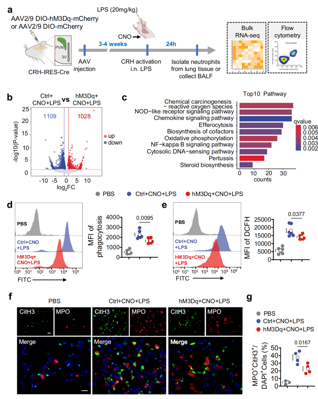 进一步对CRHᴾⱽᴺ神经元化学遗传学激活后、LPS处理小鼠肺中分离的中性粒细胞进行RNA测序(图4a),结果显示其与对照小鼠相比,有1109个基因下调、1028个基因上调(图4b)。KEGG分析提示受调控通路包括趋化因子信号通路、NF-κB信号通路等(图4c)。激活CRHᴾⱽᴺ神经元可通过流式细胞术检测到显著抑制LPS处理小鼠BALF中性粒细胞的吞噬能力(FITC标记乳胶珠摄取减少,图4d)和活性氧(ROS)生成(DCFH-DA荧光强度降低,图4e),还能显著抑制ALI时LPS诱导的小鼠肺部中性粒细胞胞外陷阱(NETs,通过CitH3与MPO共染色证实,图4f-g)形成。综上表明CRHᴾⱽᴺ神经元激活可抑制ALI期间中性粒细胞的致病性功能。