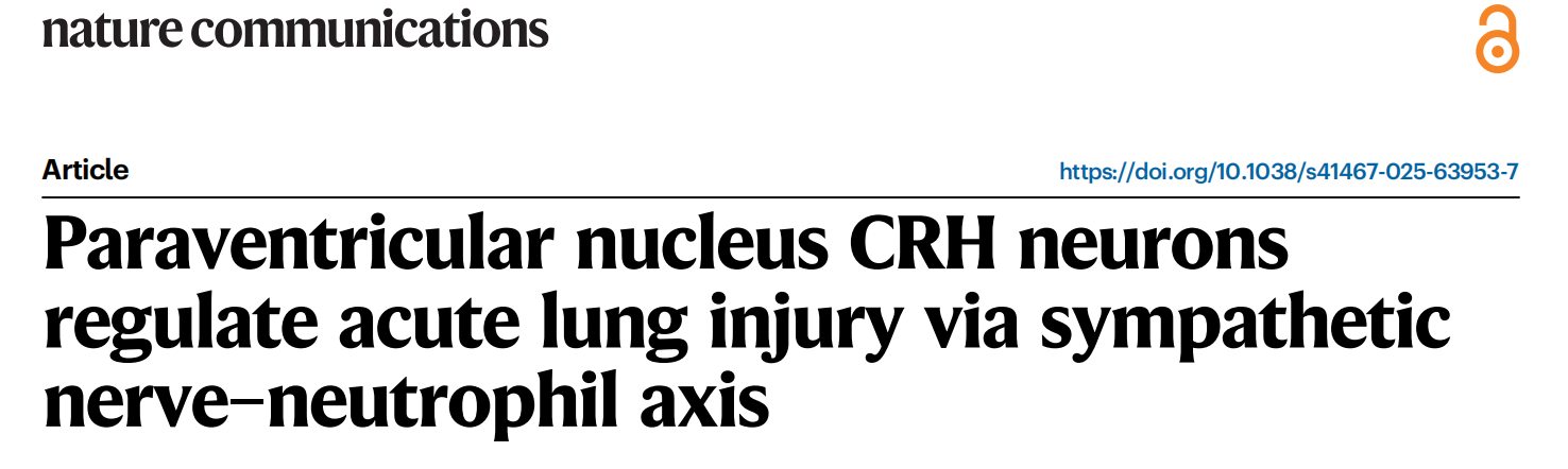 2025年10月6日,中南大学湘雅二医院戴茹萍/李卉研究团队在Nature communications杂志发表了题为“Paraventricular nucleus CRH neurons regulate acute lung injury via sympathetic nerve–neutrophil axis”的研究论文。该研究以雄性小鼠为模型,经解剖追踪、化学遗传学调控及药物干预,发现ALI期间一条下丘脑室旁核CRHᴾⱽᴺ神经元-肺神经回路,激活该神经元可保护小鼠ALI、提升存活率并减少肺部中性粒细胞浸润,抑制则加重ALI。该保护作用由交感神经活性增强实现,局部释放去甲肾上腺素经β2-肾上腺素受体-β-arrestin2信号调控中性粒细胞功能,抑制NF-κB通路。这一发现为解析中枢神经系统主动调控ALI的机制提供了关键理论支撑,也为ALI及ARDS治疗靶点开发提供新思路。