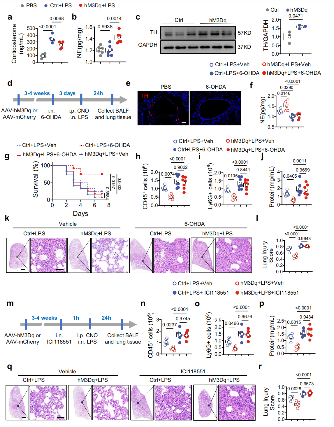 交感神经系统(SNS)和下丘脑-垂体-肾上腺(HPA)轴是CRHᴾⱽᴺ神经元介导神经免疫对话的核心系统。激活CRHᴾⱽᴺ神经元虽对血浆皮质酮(HPA轴相关)的影响因状态而异(基础状态下升高、LPS处理下降低),但均能增加肺组织去甲肾上腺素(NE)(图5a-b),另外CRHᴾⱽᴺ神经元激活可上调儿茶酚胺合成的限速酶酪氨酸羟化酶TH的表达(图5c),这表明肺SNS活性增强。后续实验显示,鼻内滴注6-羟基多巴胺(6-OHDA)消融肺交感神经(图5d)或给予β₂-肾上腺素能受体(β₂-AR)拮抗剂ICI118551阻断肺β₂-AR后(图5m),CRHᴾⱽᴺ神经元激活对ALI的保护效应(改善生存率、减少白细胞浸润等)均消失(图5g-j),小鼠肺损伤加重(图5k、l、n-r)。综上表明肺SNS和β₂-AR均参与该神经元介导的ALI保护作用。