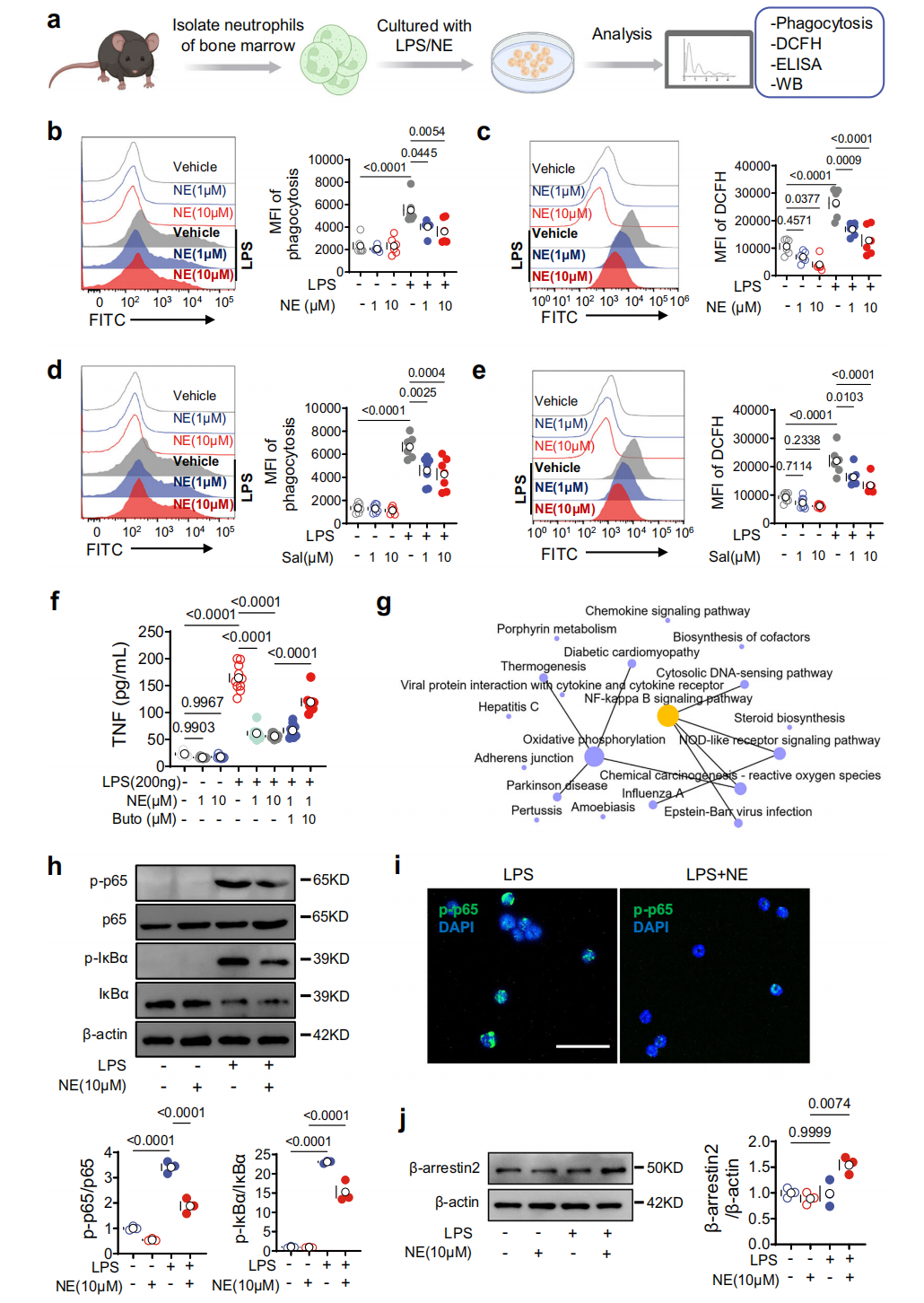 为明确肺SNS对中性粒细胞功能的影响,体外检测了NE对骨髓分离中性粒细胞的作用。结果显示NE可降低LPS诱导的骨髓中性粒细胞吞噬作用(图6b)、活性氧(ROS)生成(图6c)及TNF表达(图6f),β₂-AR激动剂沙丁胺醇也有类似抑制效果(图6d-e),表明NE通过β₂-AR信号抑制中性粒细胞对LPS的反应。对LPS处理的对照组和hM3Dq表达小鼠肺中性粒细胞的RNA测序发现,NF-κB信号通路是CRHᴾⱽᴺ神经元激活调控的核心通路(图6g)。NE可抑制LPS处理中性粒细胞中p65、IκBα的磷酸化(图6h)及p-p65核转运(图6i),并上调β₂-AR相关的NF-κB负调控因子β-arrestin2(图6j),已知β-arrestin2是β₂-AR激活的NF-κB信号通路负调控因子。综上表明NE主要通过β₂-AR/β-arrestin2依赖的NF-κB信号抑制作用调控中性粒细胞功能,这也是 CRHᴾⱽᴺ神经元激活发挥ALI保护作用的潜在机制。
