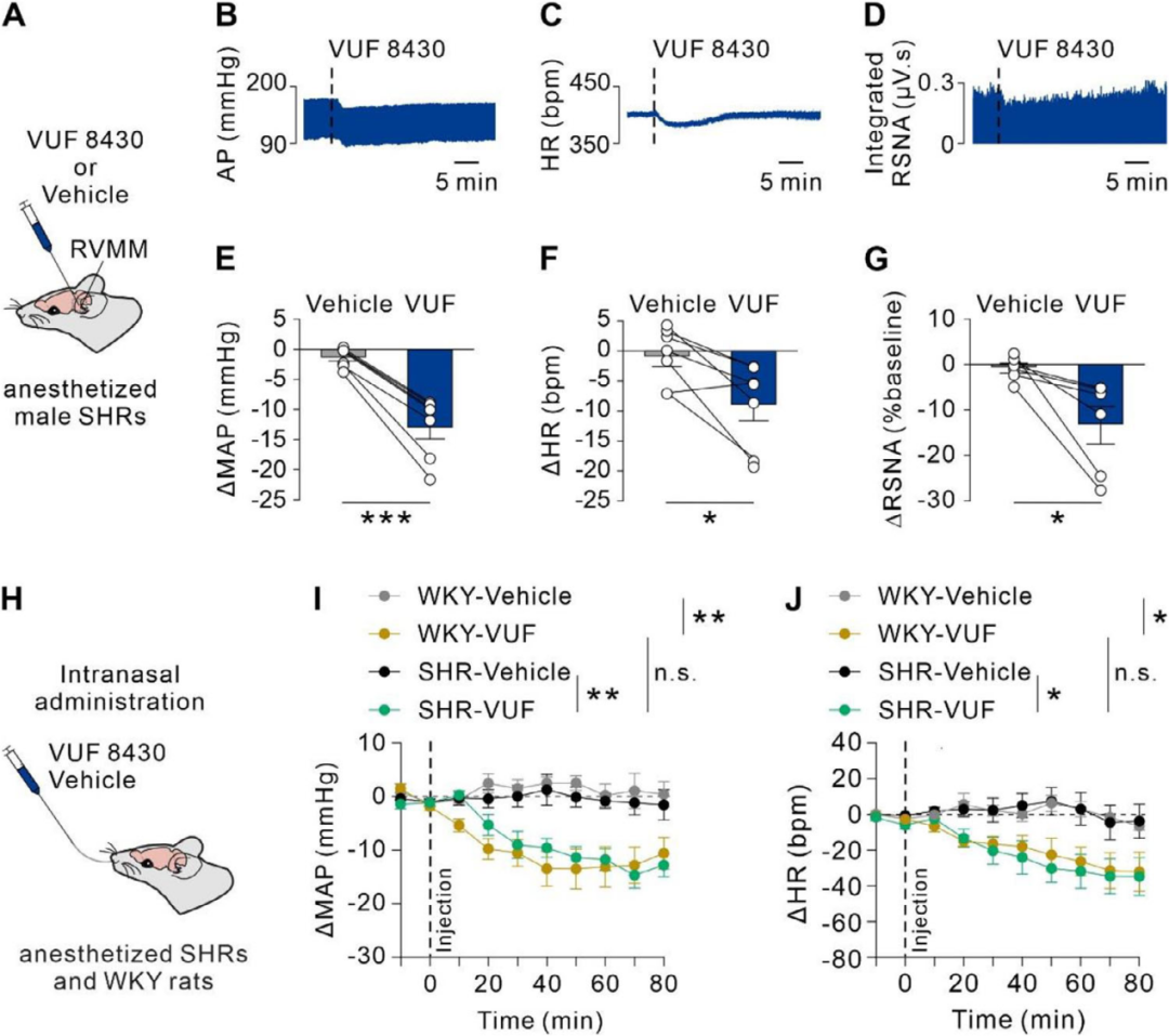 采用自发性高血压大鼠(SHRs)和慢性不可预测轻度应激(CUMS)诱导高血压大鼠(两种原发性高血压模型),探究RVMM-H4R的降压治疗潜力,已知过度交感活性是两类模型高血压的关键诱因。在SHRs的RVMM局部注射 H4R激动剂VUF 8430:与对照组比,MAP、HR和RSNA均显著降低(图7A-G),雌雄效应一致;H4R激活的降压效应在高血压与正常血压大鼠中无差异。全身给药实验,经鼻递送VUF 8430在高血压与正常血压大鼠中降压、心动过缓效应相当(图7H-J);分子水平上,高血压大鼠(SHRs、CUMS)RVMM 中H4R mRNA表达及组胺含量与正常大鼠无差异,提示高血压状态下H4R介导的神经调节功能完整,且H4R是稳定调节系统,非高血压致病因素。