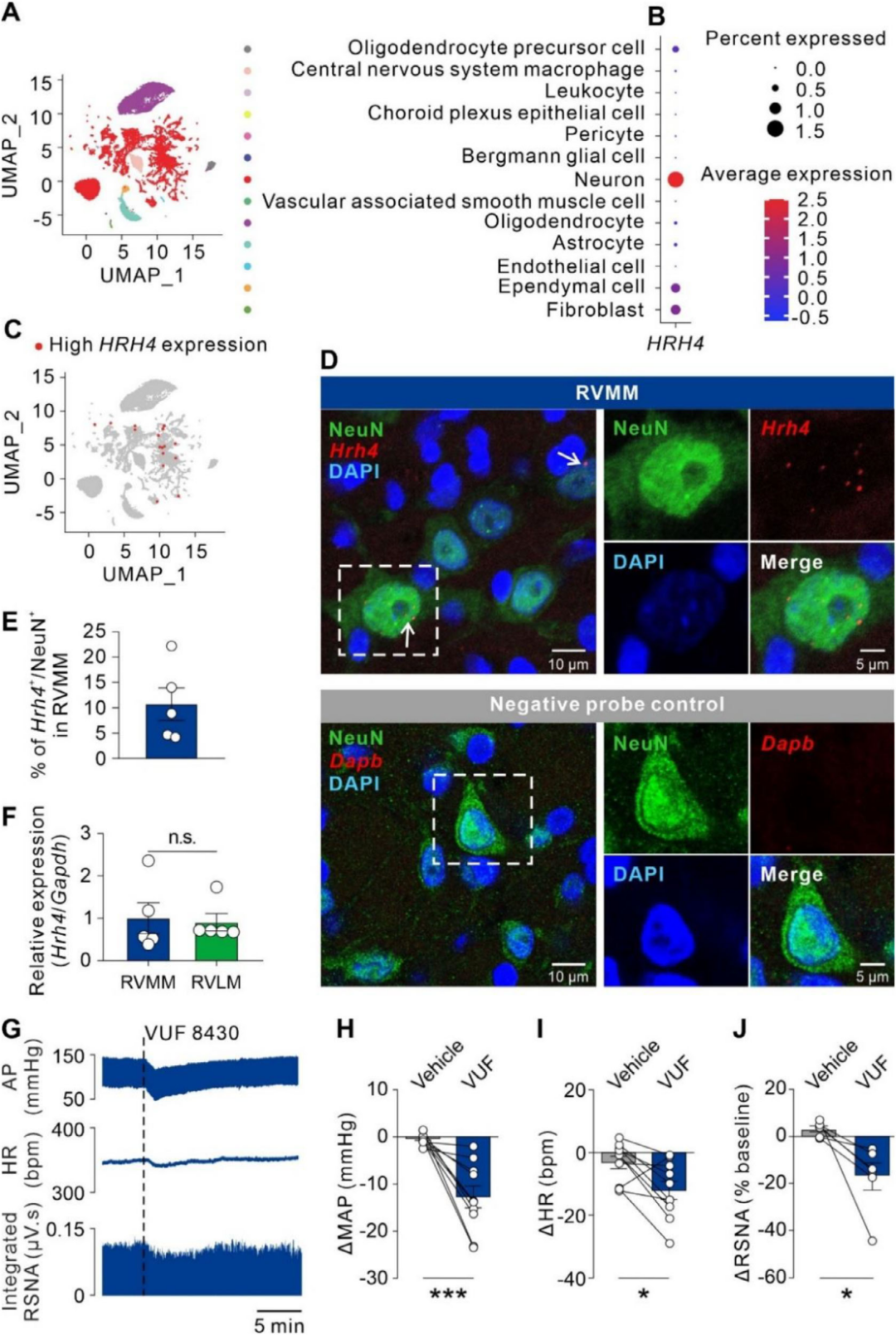 利用人类脑细胞图谱1.0版的单核RNA测序(snRNA-seq)数据集分析人类延髓(含心率与血压调控中枢)中H4R表达:对203472个细胞经卢万聚类(scikit-network)得到13个细胞群(图1A),神经元细胞群中H4R基因(HRH4)表达相对较高(图1B-C)。采用RNA原位杂交(RNAscope)结合免疫荧光,检测大鼠延髓交感心血管中枢RVMM与RVLM的H4R分布,两区域均检测到Hrh4荧光信号,且与NeuN阳性神经元共定位(图1E-D);RT-qPCR显示两区域Hrh4表达水平相当(图1F)。结合人类延髓转录组数据,提示H4R在哺乳动物延髓表达具有保守性。