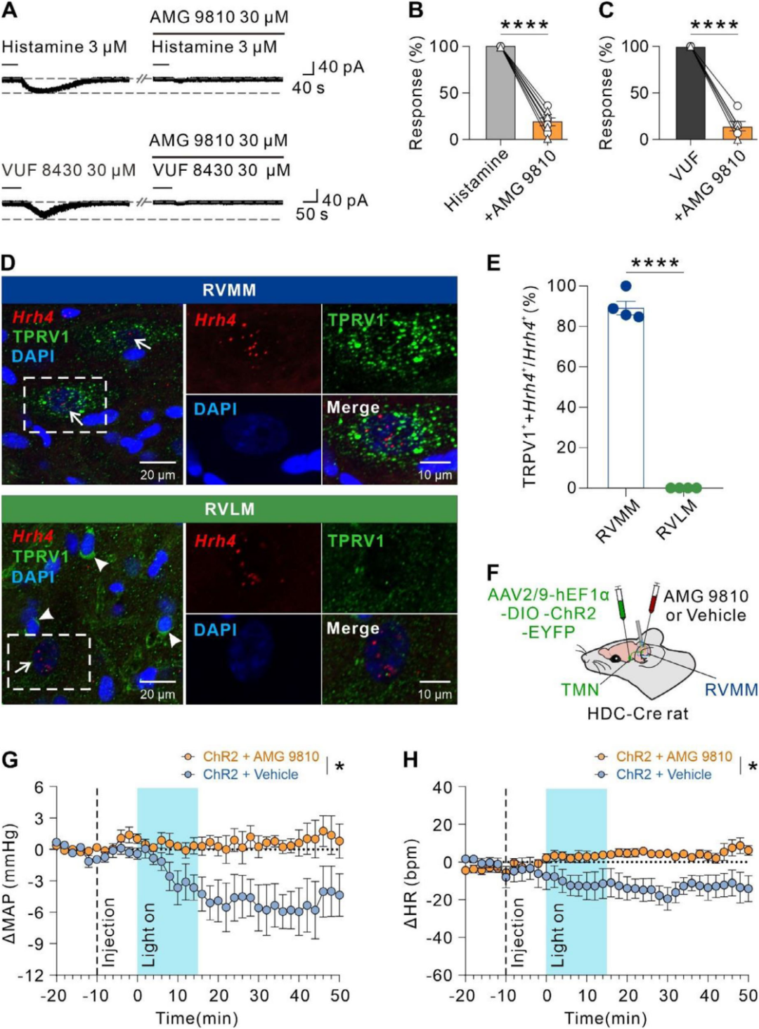 H4R激活介导兴奋效应的中枢离子机制不明,已知TRPV1参与外周DRG神经元中H4R诱发的兴奋,故用含TRPV1拮抗剂AMG 9810的ACSF(人工脑脊液)灌流脑片,探究其对H4R激活诱导RVMM神经元兴奋的介导作用。结果显示,30μM AMG 9810几乎完全阻断3μM组胺诱导的RVMM神经元内向电流(图5A-B),也完全阻断30μM VUF 8430诱导的内向电流(图5A、C),表明H4R激活通过开放TRPV1兴奋RVMM神经元。还检测了TRPV1在RVMM中的分布情况,RVMM中89.83%±3.51%含H4R阳性的神经元共表达TRPV1(图5D-E);RVLM虽有TRPV1表达,但H4R与TRPV1无共定位(图5D-E),进一步佐证TRPV1介导H4R对RVMM神经元的兴奋效应。体内实验中,向RVMM微注射AMG 9810,可完全阻断光遗传学激活TMN-RVMM组胺能投射(图5F)诱导的降压(图5G)和心动过缓(图5H)反应。综上,H4R及其下游TRPV1通道共同介导RVMM组胺能传入信号诱导的RVMM神经元兴奋,以及后续降压和心动过缓反应。