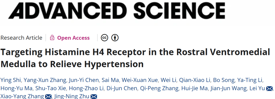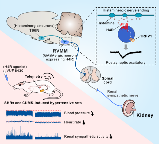 2025年9月29日,南京大学生命科学学院、医药生物技术全国重点实验室和脑科学研究院朱景宁教授团队在Advanced Science(IF=14.1)上发表题为“Targeting Histamine H4 Receptor in the Rostral Ventromedial Medulla to Relieve Hypertension”相关文章,该研究聚焦难治性高血压的中枢调控机制,首次发现组胺受体家族H4R在人和大鼠的延髓头端腹内侧区(RVMM)保守表达,RVMM是关键的交感心血管调节中枢;激活RVMM中H4R可通过瞬时受体电位香草酸1(TRPV1)通道兴奋GABA能交感前神经元,进而引发降压和心动过缓反应,同时抑制肾交感神经活动(RSNA);在自由活动的自发性高血压大鼠(SHRs)和应激诱导高血压大鼠(CUMS大鼠)中,经鼻递送H4R激动剂能产生持续降压效果。