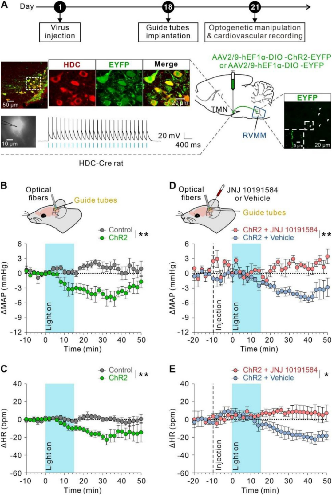 为了明确RVMM组胺能传入纤维的心血管调节作用,参照既往研究构建HDC(内源性组胺合成关键酶)启动子调控Cre重组酶的转基因大鼠,在其TMN组胺能神经元中选择性表达ChR2-EYFP病毒,探究光遗传学激活TMN-RVMM投射的影响(图2A)。结果显示ChR2-EYFP及对照病毒在TMN选择性表达且与HDC阳性神经元共定位(图2A);全细胞膜片钳证实5Hz蓝光脉冲(10ms)可诱导神经元高保真发放动作电位(图2A);EYFP标记的组胺能传入纤维在RVMM可见曲张体(神经纤维上的串珠状膨大结构,其本质是神经末梢的“递质储存与释放位点”)(图2A),直接证明TMN神经元可通过纤维投射到RVMM并释放组胺。