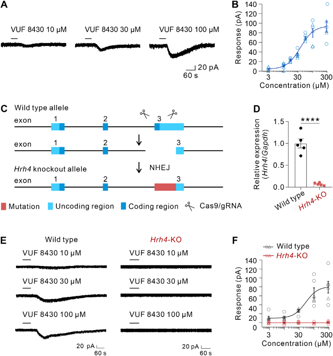 为了明确H4R介导心血管效应的细胞机制,本研究采用全细胞膜片钳记录技术,探究H4R激活对RVMM神经元电生理活动的影响,结果发现选择性H4R激动剂VUF 8430以浓度依赖方式兴奋RVMM神经元,均可诱导内向电流(图3A-B),拟合浓度-反应曲线得EC₅₀=37.63μM(图3B)。野生型小鼠中VUF 8430呈浓度依赖性反应;进一步在Hrh4-KO小鼠(Hrh4表达完全缺失,图3C-D)中验证VUF 8430特异性,即使300μM VUF 8430也无法激活RVMM神经元(图3E-F),证实VUF 8430对RVMM神经元的兴奋效应由H4R特异性介导。此外,VUF 8430对RVLM神经元无显著影响,与“RVLM中H4R激活无心血管反应”结果一致,提示H4R激活仅兴奋RVMM神经元,不兴奋RVLM神经元。