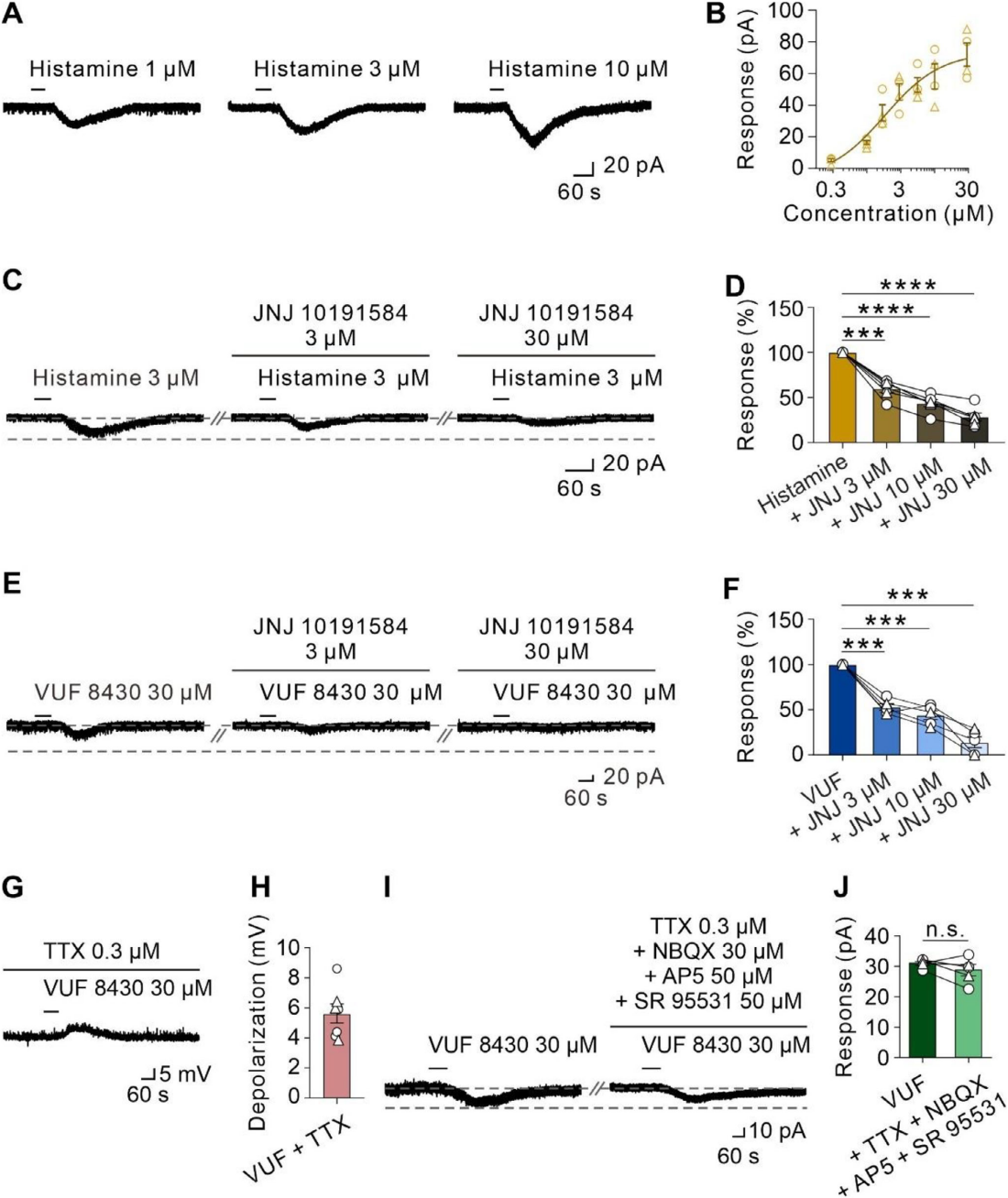 图4 选择性H4R拮抗剂JNJ 10191584可阻断组胺和VUF 8430诱发的内向电流
