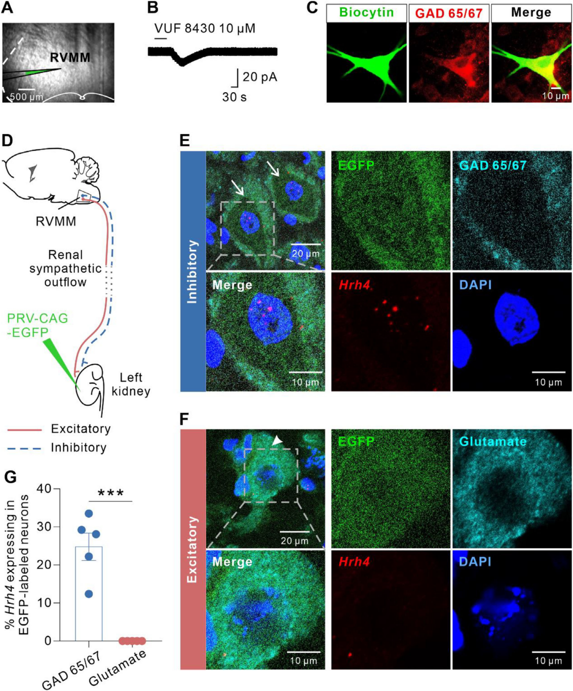 已知降压、心动过缓常由肾交感神经活性(RSNA)抑制引发,且RVMM含兴奋性与抑制性交感前神经元,故探究H4R介导交感传出抑制的机制。采用电极记录RVMM神经元全细胞电流,发现经H4R激动剂VUF 8430灌流后被兴奋的RVMM神经元,均呈GAD65/67免疫阳性(图6A-C),提示H4R激活可兴奋RVMM的GABA能神经元。为了验证该GABA能神经元是否为交感抑制性神经元,将逆行跨多突触示踪剂伪狂犬病病毒(PRV)注射至肾实质,标记RVMM内谷氨酸阳性交感兴奋性神经元与GAD65/67阳性交感抑制性神经元(图6D)。RNA原位杂交显示,Hrh4信号定位于PRV标记的RVMM GABA能神经元(图6E-6G);而投射至肾的谷氨酸能交感兴奋性神经元中,未检测到Hrh4 mRNA(图6F-G)。综上,H4R激活可直接兴奋RVMM 的GABA能交感前神经元,进而抑制肾交感神经传出,诱导降压、心动过缓反应。