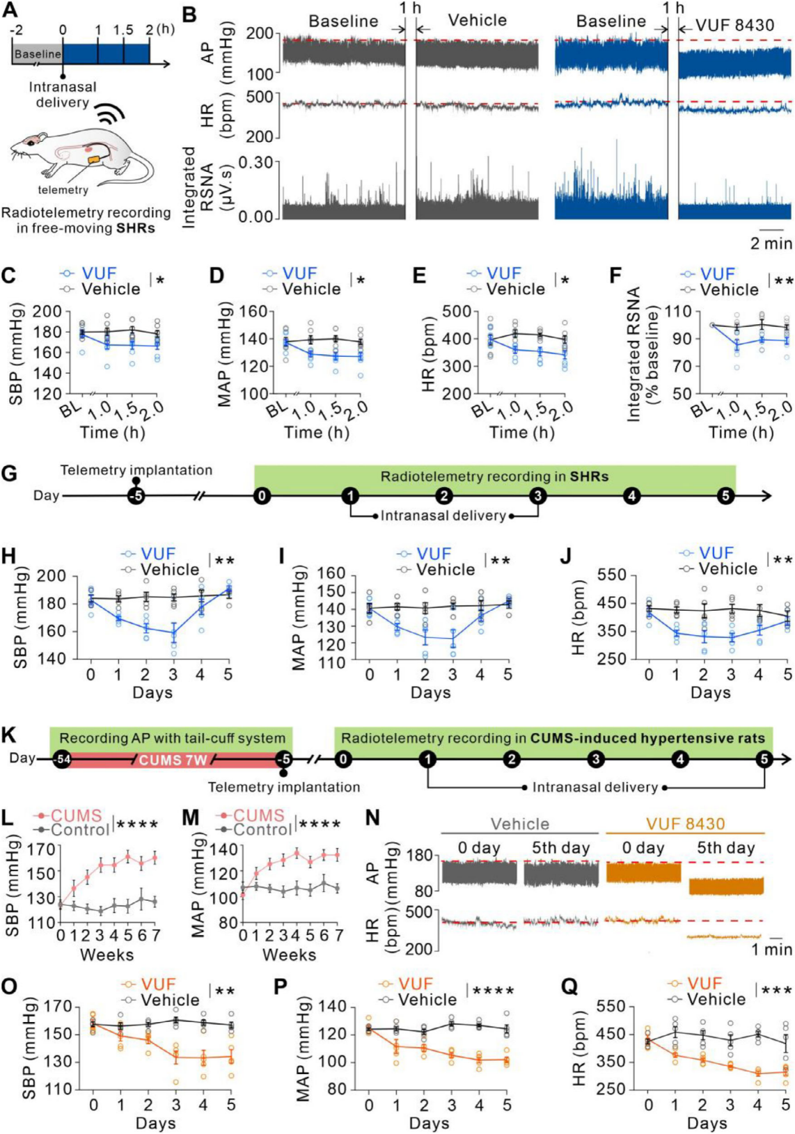 为了评估慢性组胺H4受体激活的治疗潜力,用无线电遥测监测自由活动SHRs(图8A),单次经鼻VUF 8430可降SBP、MAP、HR并抑制RSNA,与麻醉状态一致(图8B-F);连续3天每日经鼻给药,SHRs血压、心率持续下降,停药后恢复(图8G-J)。鉴于长期应激是高血压高发诱因,进一步探究经鼻VUF 8430对7周慢性不可预测轻度应激(CUMS)诱导高血压大鼠的影响(图8K)。与既往研究一致CUMS大鼠SBP、MAP显著升高且维持高位(图8L-M),连续5天每日经鼻给药,可逐步持续降低其SBP、MAP、HR(图8N-Q)。综上,组胺H4R或为治疗神经源性高血压的潜在中枢靶点。