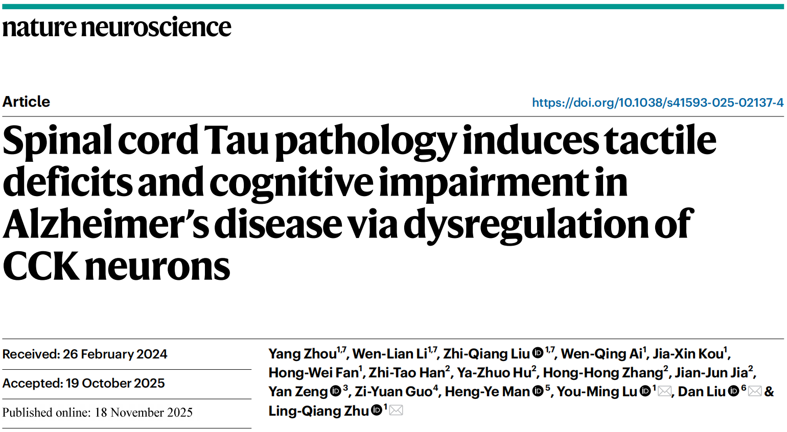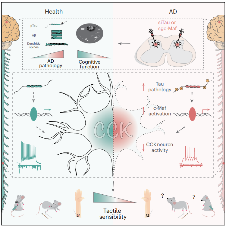 2025年11月18日,华中科技大学同济医学院朱铃强/刘丹/鲁友明教授团队在Nature Neuroscience上发表题为“Spinal cord Tau pathology induces tactile deficits and cognitive impairment in Alzheimer’s disease via dysregulation of CCK neurons”研究论文,聚焦AD中触觉缺陷与认知障碍的关联机制,发现 AD 患者及 AD 模型小鼠存在触觉功能损伤,且损伤程度与蒙特利尔认知评估(MoCA)评分呈负相关、与脊髓Tau病理呈正相关;并证实脊髓中异常高磷酸化的Tau通过激活转录因子c-Maf,从而抑制CCK神经元的活性,为AD早期诊断(以触觉缺陷为无创生物标志物)和治疗(靶向Tau或c-Maf)提供新方向。
