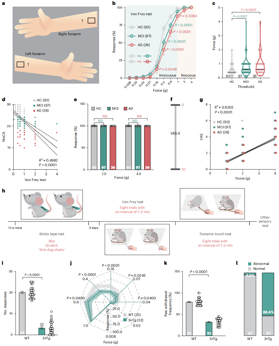 研究人员对216名≥65岁参与者(健康对照组HC 93人、轻度认知障碍组MCI 97人、阿尔茨海默病组AD 26人)进行触觉检测,依据蒙特利尔认知评估(MoCA)评分分组(HC 25-30分、MCI 19-24分、AD 0-18分),采用冯・弗雷(Von Frey)刺激前臂,测试无害(0.4g、0.6g)及有害(2.0g、4.0g)机械刺激敏感性(图1a)。结果显示,MCI与AD患者对无害刺激的响应率显著降低,触觉阈值高于HC组,且阈值与MoCA评分呈负相关(图1b-d);但三组对有害刺激的响应无显著差异,视觉模拟评分(VAS,用于评估疼痛强度)与刺激力度正相关(图1e-g)。小腿部位检测结果一致,触觉异常比例为:MCI患者前臂63.9%、小腿66.3%,AD患者前臂73.1%、小腿82.4%,证实MCI与AD患者触觉损伤但痛觉正常。