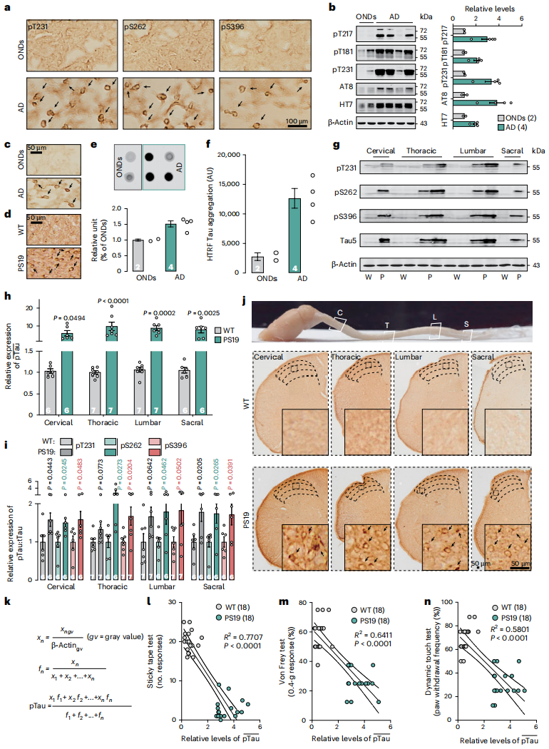 进一步在三种小鼠模型验证:仅含Tau病理的PS19、rTg4510小鼠(Tau-P301L突变型)出现多毛/无毛皮肤触觉脱敏,仅含Aβ沉积的APP/PS1小鼠(APP695swe/PS1-dE9突变型)触觉正常;PS19、rTg4510小鼠脊髓后角存在Tau病理,APP/PS1小鼠无(图2d、g-j),且所有小鼠的痛觉、瘙痒感知及运动协调能力均正常。PS19小鼠定量分析显示脊髓全段Tau磷酸化(T231、S262等)及总Tau水平升高(图2g-j),通过加权公式定量Tau病理(pTau)值,与粘性胶带、Von Frey及动态触觉测试结果呈负相关(图2k-n),证实脊髓Tau病理是AD模型小鼠触觉异常的关键诱因。