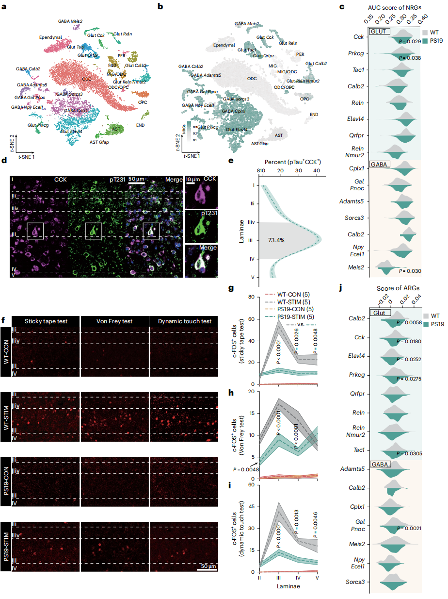 为了探究Tau病理损害触觉的机制,研究对PS19小鼠与WT小鼠腰段脊髓(L1-L4)背角进行单核RNA测序(snRNA-seq),识别出8种谷氨酸能神经元、7种GABAergic神经元及7种非神经元细胞,两类小鼠细胞比例无差异(图3a)。借助AUCell工具计算神经原纤维缠结(NFT)相关基因(NRG)转录组变化,发现神经元NRG表达高于非神经元细胞(图3b),且PS19小鼠中NRG异常在CCK、PKCγ(Prkcg编码)、Meis2表达神经元中最显著(图3b-c),其他神经元(如PKCγ)呈分散异常。PS19小鼠与AD患者的CCK神经元中,T231、S262位点及AT8(pS202/pT205)位点Tau过度磷酸化水平显著高于其他神经元(图3d),且该Tau病理富集于脊髓背角IIiv-IV层(无害触觉信号整合传递关键区)(图3e)。c-FOS标记显示,PS19小鼠该层神经元在触觉测试中活性降低(图3f-i),且CCK神经元等6类神经元的活性调节基因(ARG)表达下调最显著(图3j),但暂无法确定CCK神经元中Tau病理是NRG异常与ARG下调的直接原因。