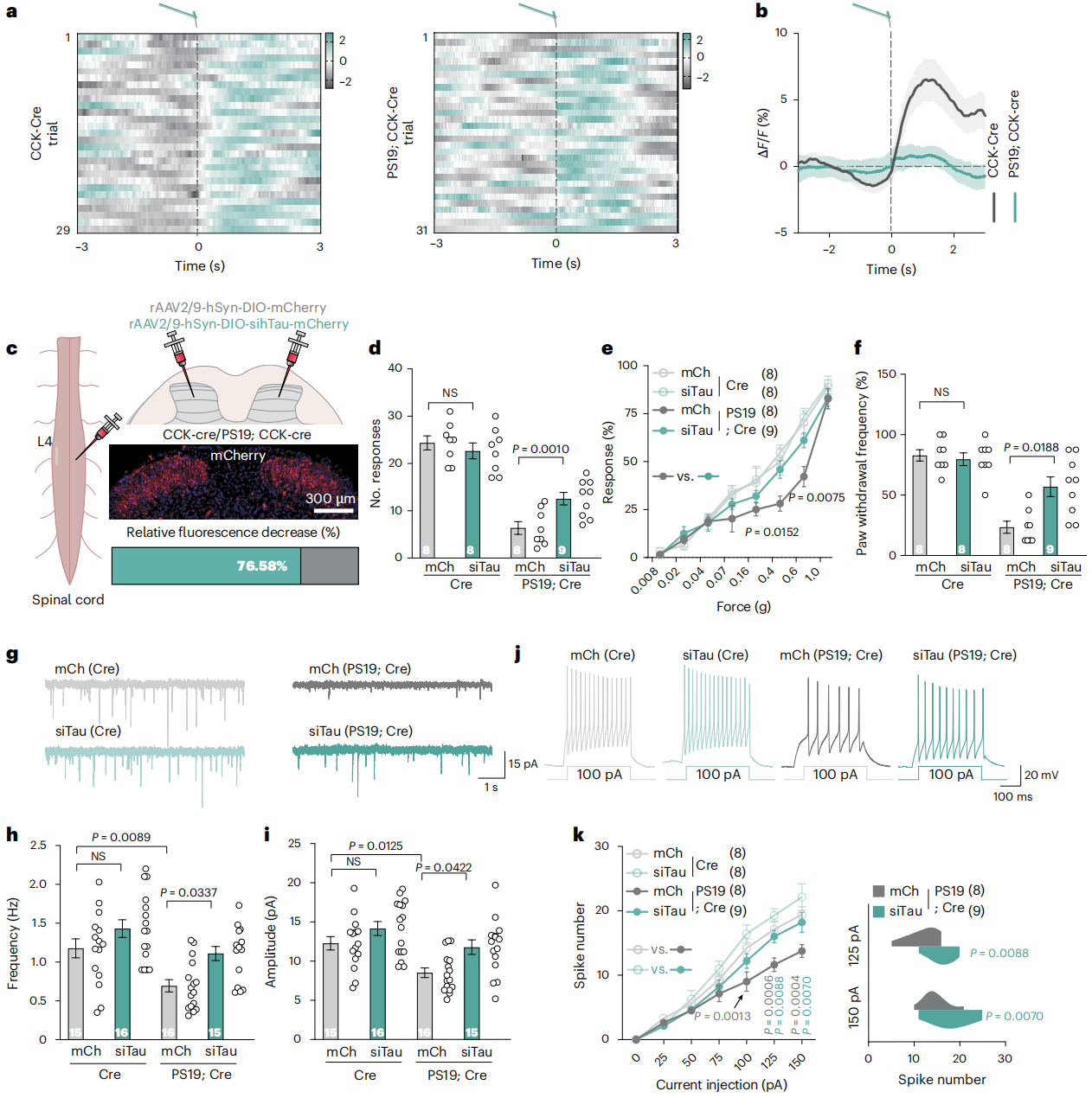 为了观察自由活动小鼠脊髓CCK神经元活性,研究将CCK-Cre与PS19小鼠杂交获得PS19;CCK-Cre小鼠,向其与CCK-Cre小鼠脊髓后角注射rAAV9-hSyn-DIO-jGCaMP8s病毒,使钙指示剂jGCaMP8s特异性表达于CCK神经元。钙成像显示,CCK神经元可被Von Frey刺激激活(图4a-b)。随后向PS19;CCK-Cre小鼠脊髓背角双侧注射rAAV2/9-hSyn-DIO-sihTau-mCherry(siTau,Tau沉默病毒)或对照病毒mCherry(图4c),结果显示沉默Tau可完全恢复其粘性胶带、Von Frey及动态触觉测试表现(图4d-f)。电生理记录证实,siTau小鼠CCK神经元的自发兴奋性突触后电流(sEPSC)振幅与频率均较对照小鼠恢复(图4g-k),符合突触前囊泡释放及突触后结构修复特征,且其他感觉模态不受影响。上述数据表明,脊髓后角CCK神经元因Tau病理失活是AD触觉功能障碍的诱因之一。综上,特异性抑制脊髓CCK神经元中的Tau病理,或为恢复AD患者触觉感知及突触功能的潜在策略。